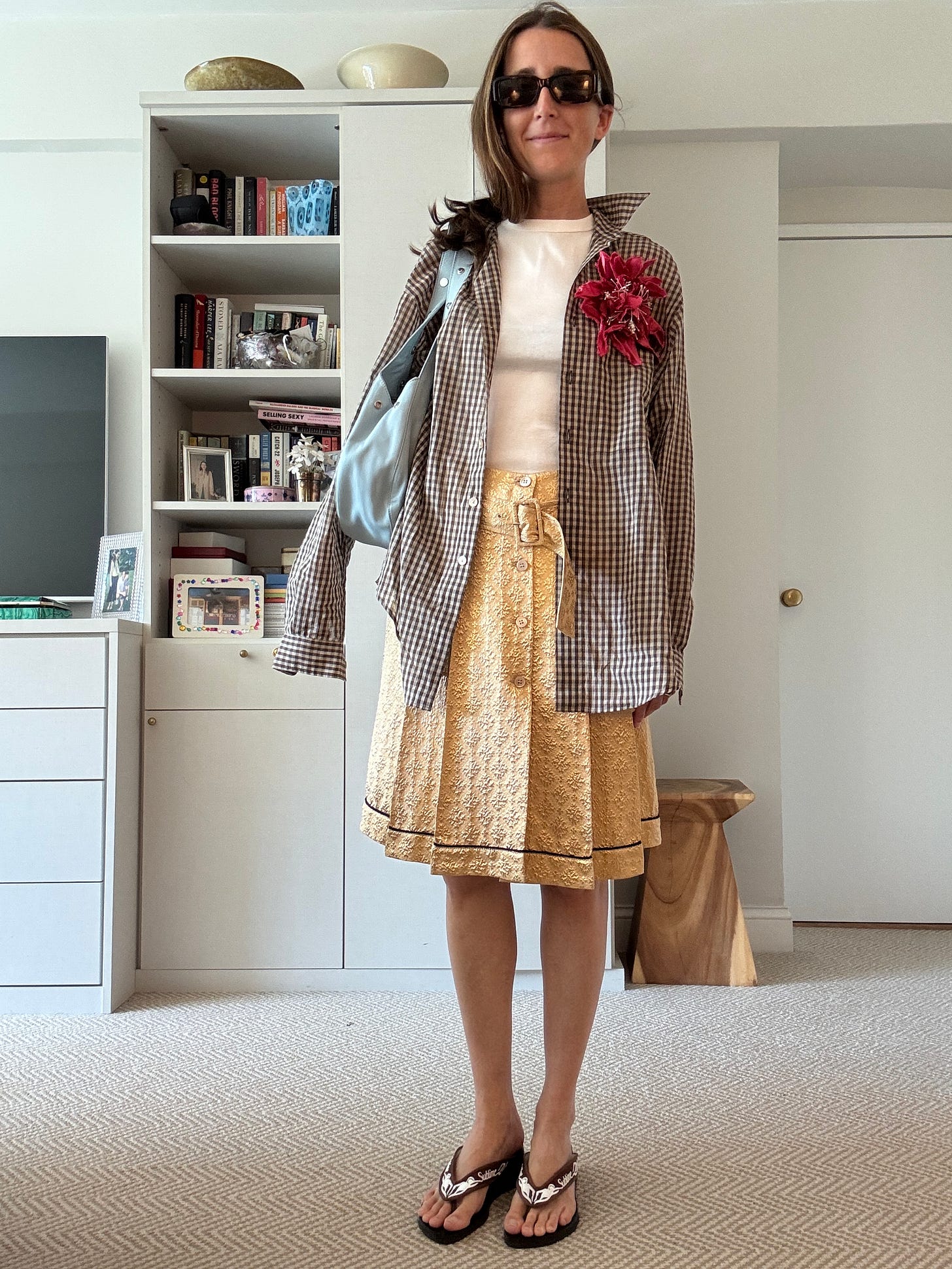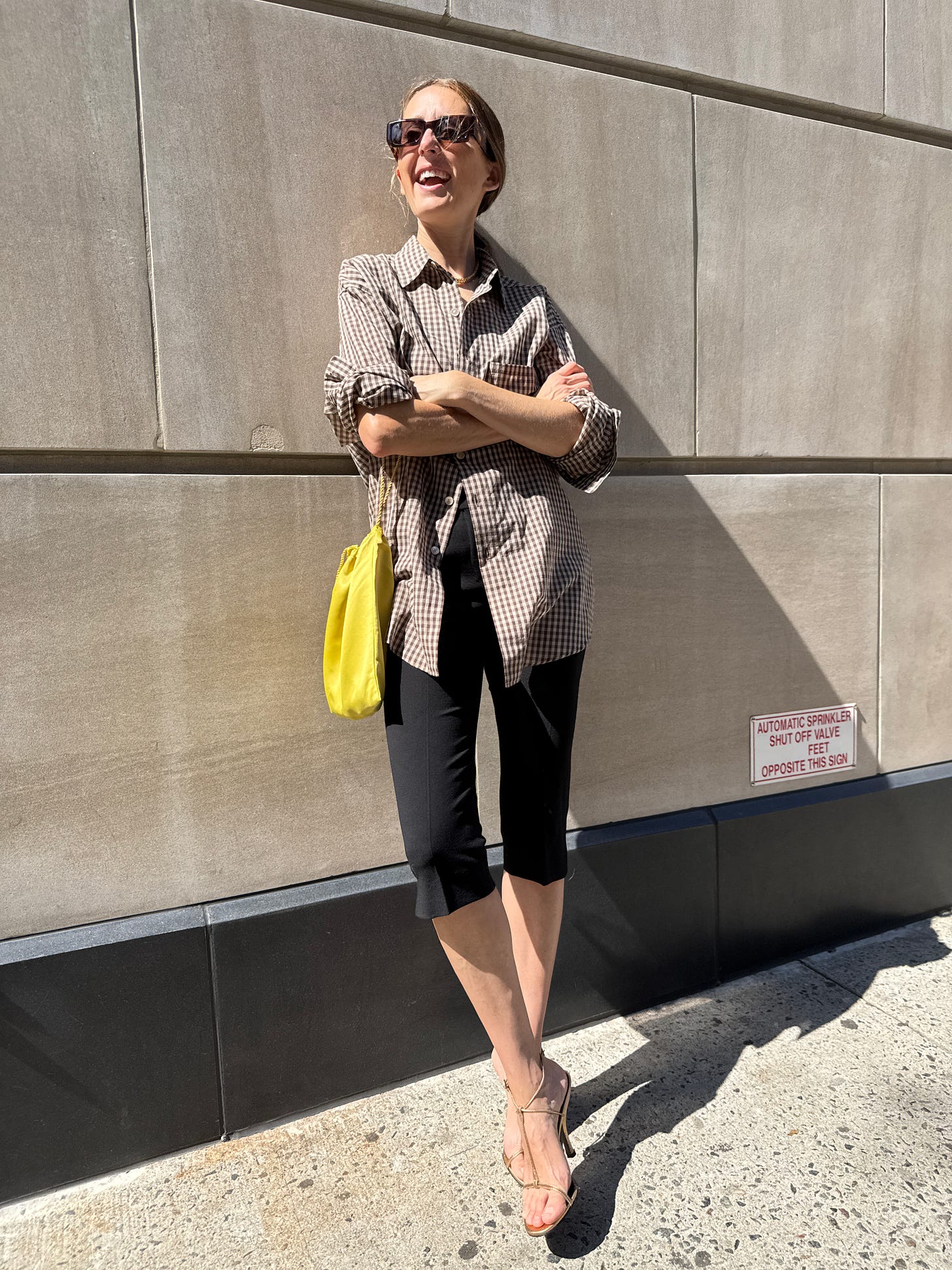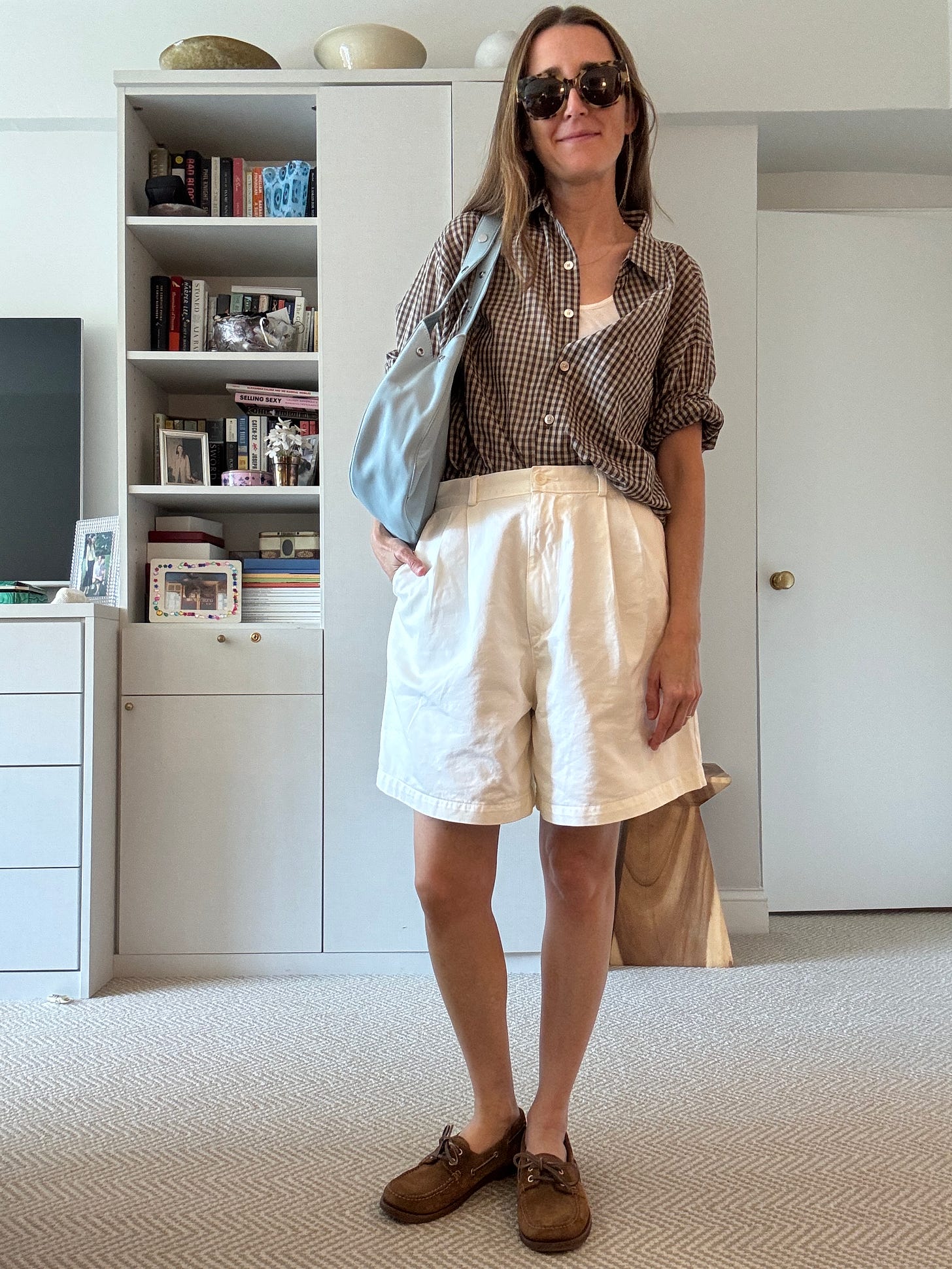 A khaki gingham shirt over a Flore Flore high neck muscle tank lets me live my best Mrs. Prada life no matter the temp. She gets full credit for the crisp, high white crew forever in my book…so here is how to lighten it up for summer.