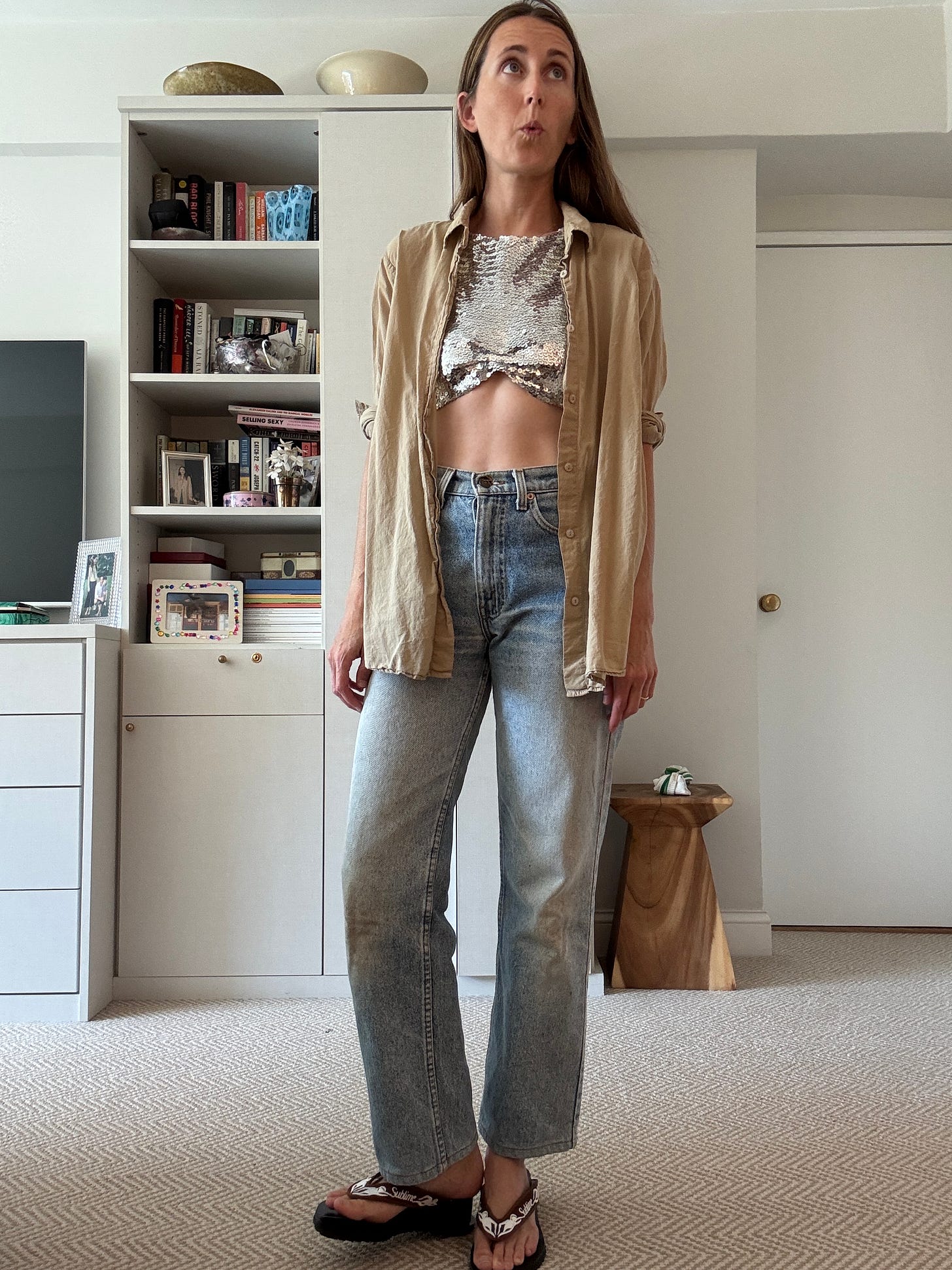 Hilariously, I ordered this sequin crop top below from the Alaia end of season sale (FINAL SALE). I did not realize it was going to be SO cropped - like literally boob grazing, so I’ve settled on it being a great sparkly layer for v-neck knits and…a khaki button down! I would totally do this for dinner (or maybe a concert if I can ever get over my fear of crowd mentality.)