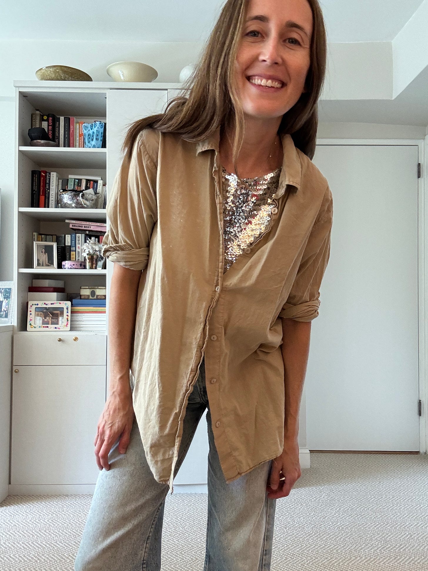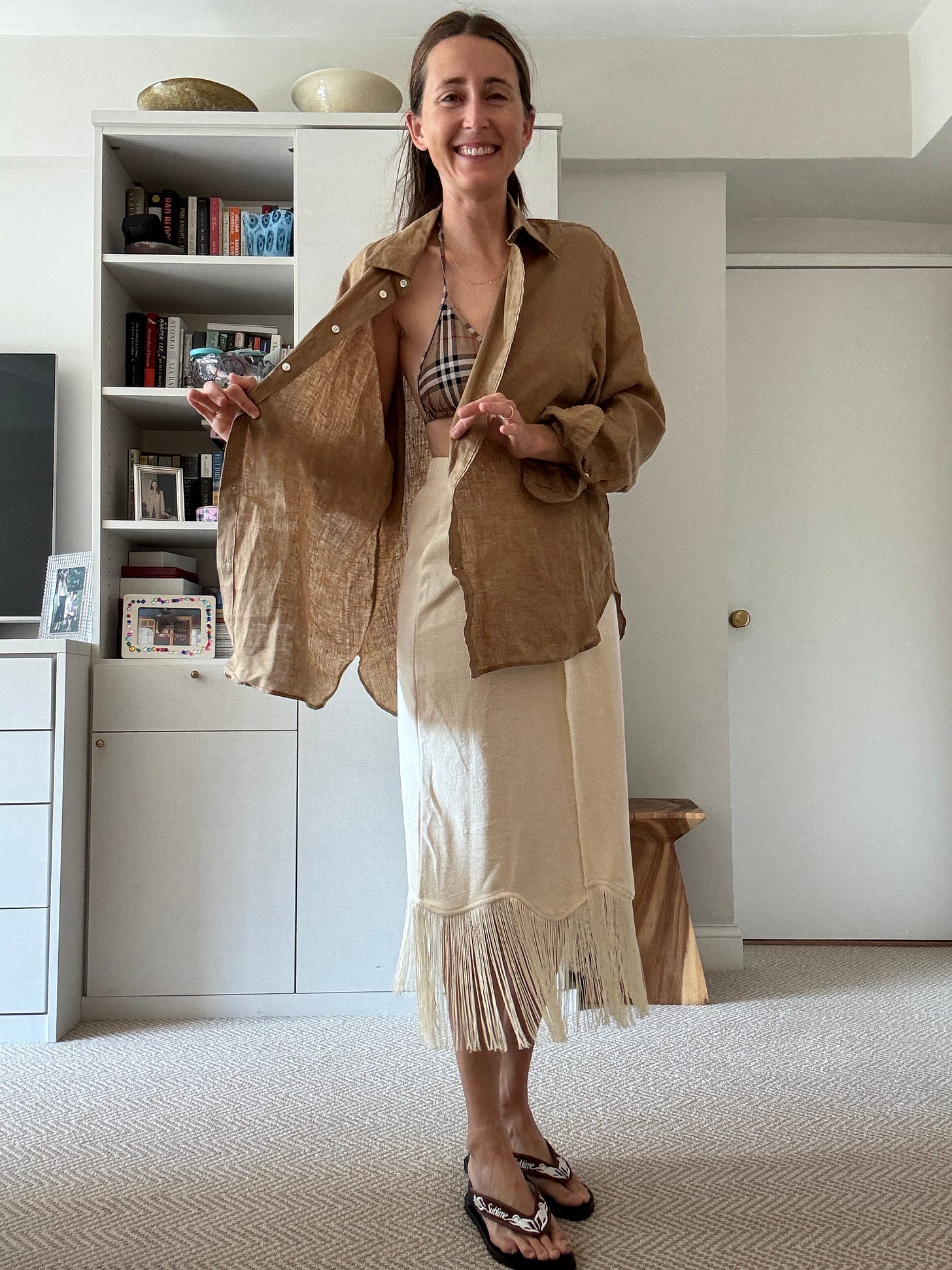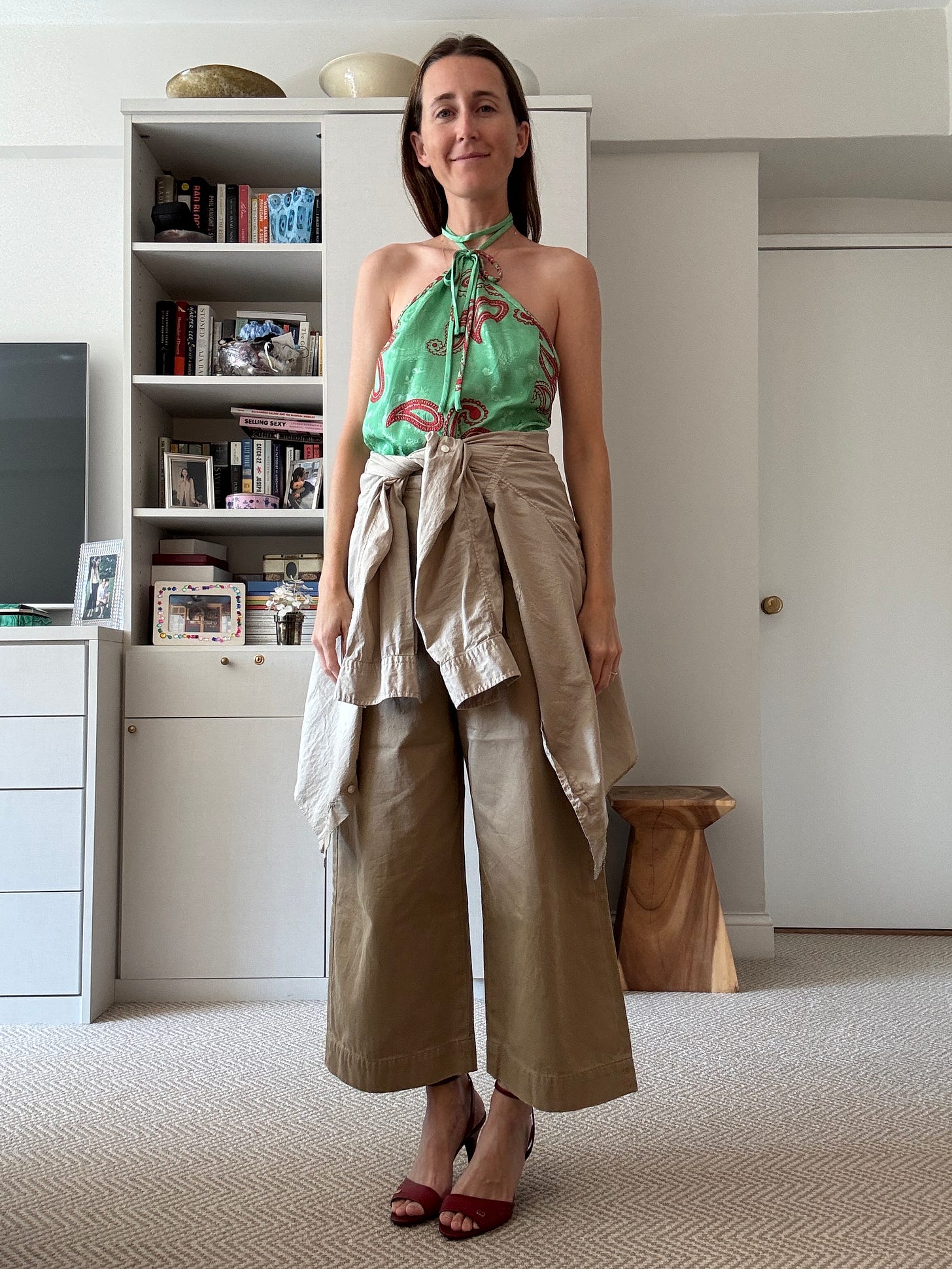 But this is not a newsletter about Ralph Lauren, so let me get to the point. These two simultaneous asks sent off a blazing lightbulb in my head. THE KHAKI SHIRT IS IT!!!! It can be thrown over just about anything and take the place of a jean jacket or cardigan. And it’s a perfectly weighted layer for a hot or chilly summer day. Worn on it’s own, sleeves rolled it provides cool (literally) coverage and cast over the shoulders, it’s an easy breezy layer. Let me show you: