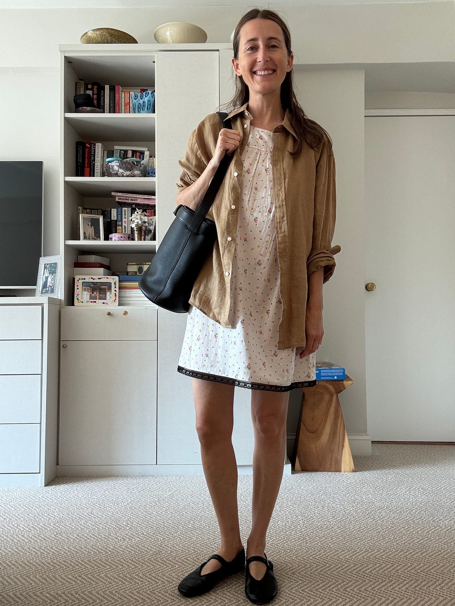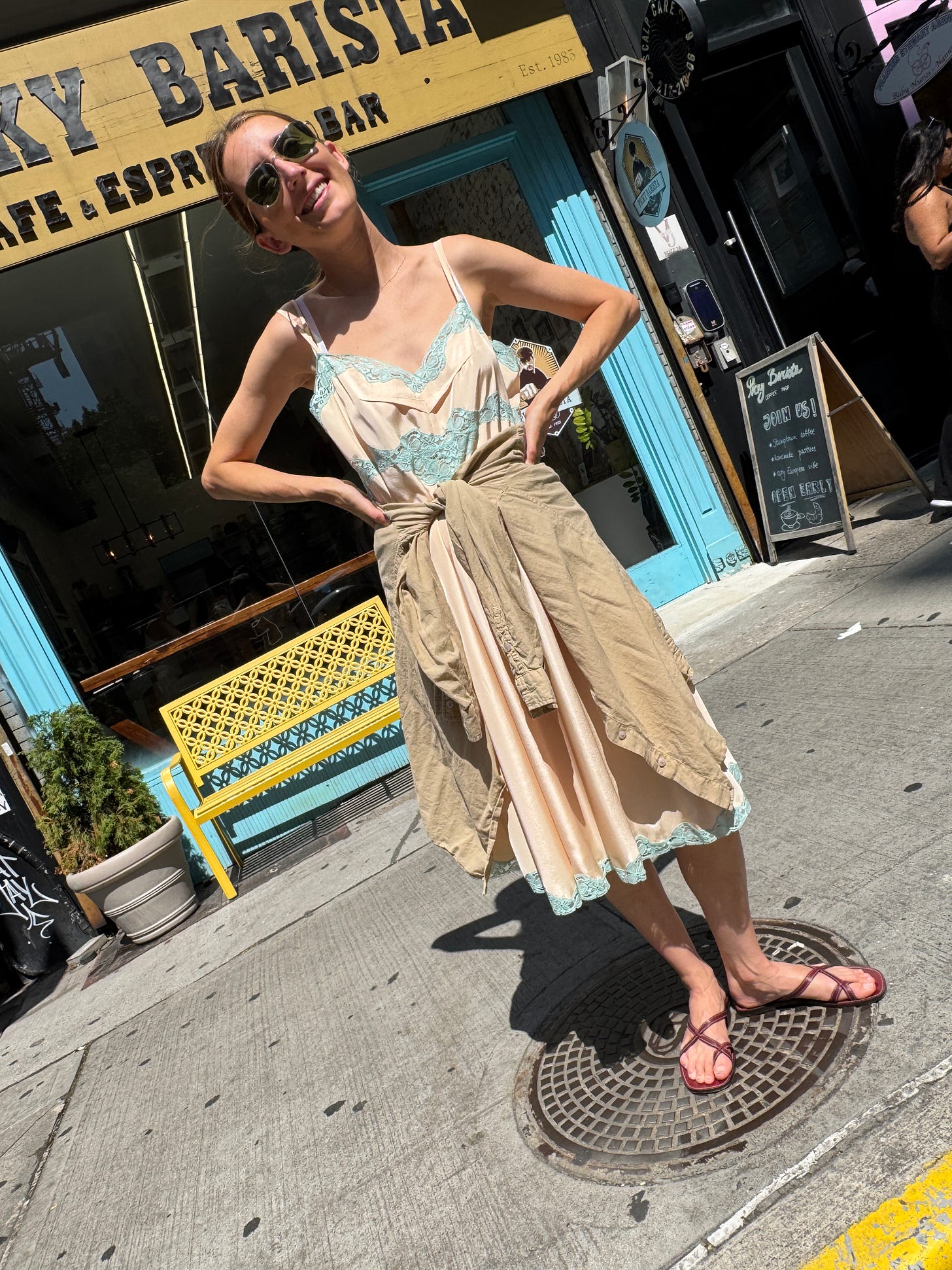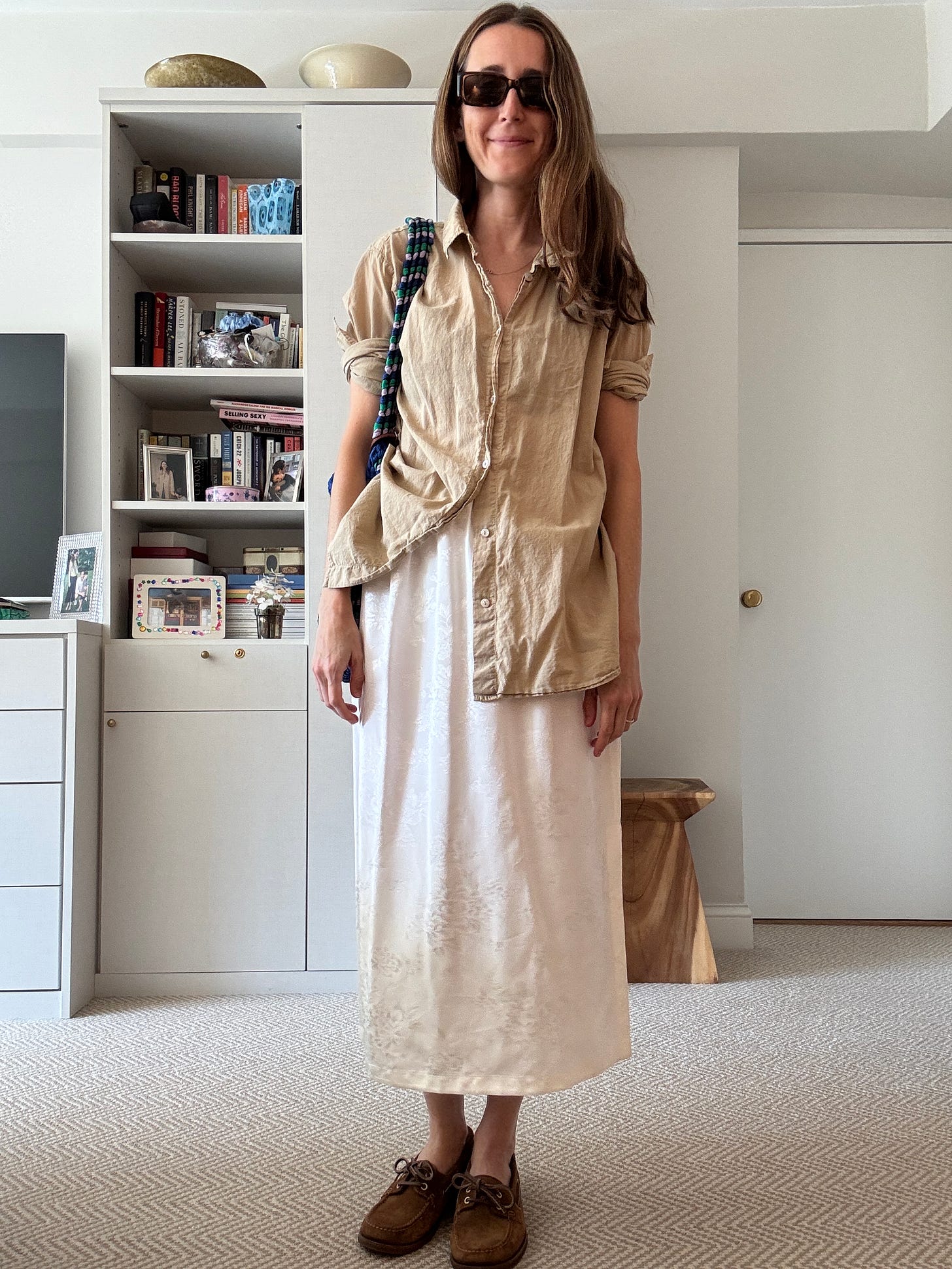 But this is not a newsletter about Ralph Lauren, so let me get to the point. These two simultaneous asks sent off a blazing lightbulb in my head. THE KHAKI SHIRT IS IT!!!! It can be thrown over just about anything and take the place of a jean jacket or cardigan. And it’s a perfectly weighted layer for a hot or chilly summer day. Worn on it’s own, sleeves rolled it provides cool (literally) coverage and cast over the shoulders, it’s an easy breezy layer. Let me show you: