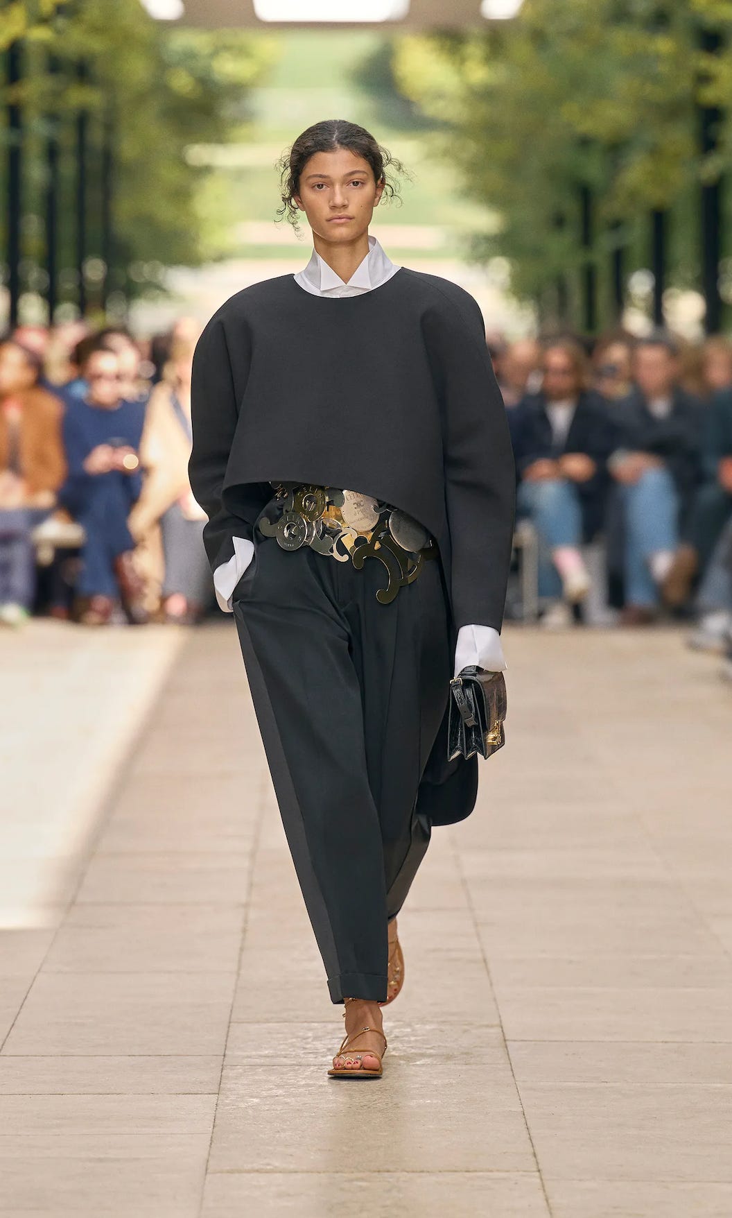 The same can be said for Celine’s sharp shapes that could all be thrown on with a fisherman sandal or jazz shoe without a second thought. A voluminous black top, over a white button down, tucked into black carrot shaped tuxedo pants and a big belt. It’s actually pretty simple when you break it down - just the right combination of special pieces, worn in a straightforward way.