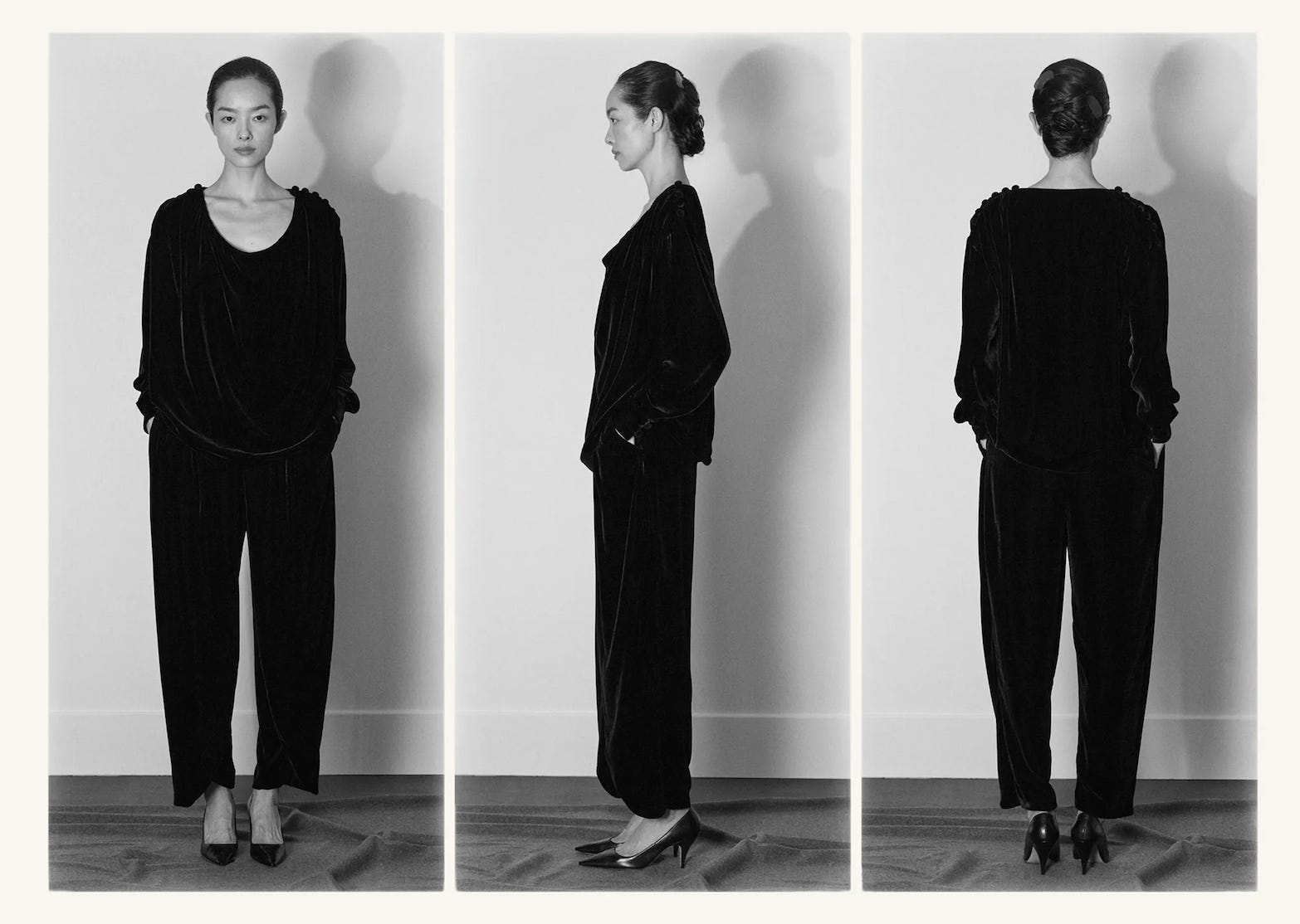 Or how about The Row’s bouncy velvet, black tie pajamas (technically pre-fall but tomato tomaaaaato.) You can barely tell from the photos but this was a deliciously rich, shiny fabric with covered buttons along the shoulders. It walked like a billion bucks and could not be an easier idea, in theory of course. But just like in all creative endeavors (cooking, design, parenting!) simple is notoriously the hardest outcome to ace.