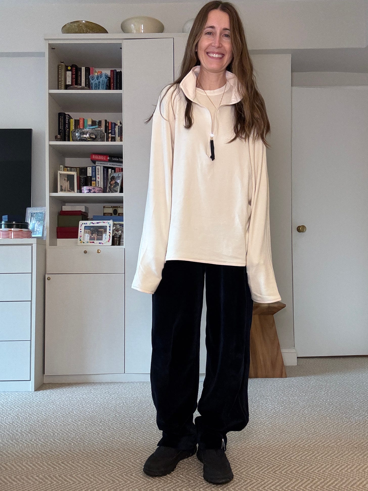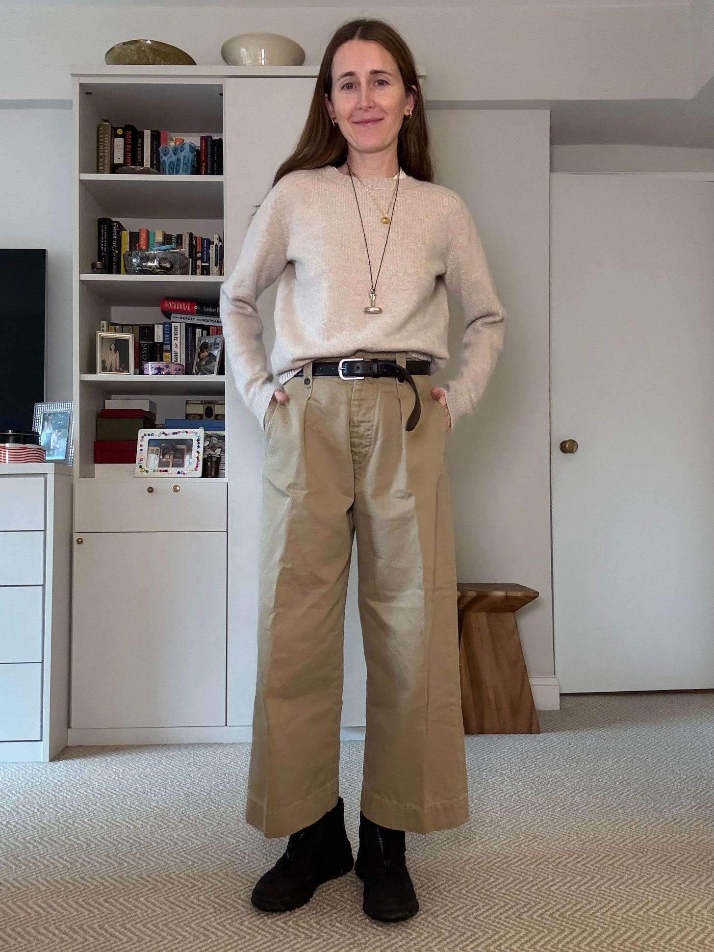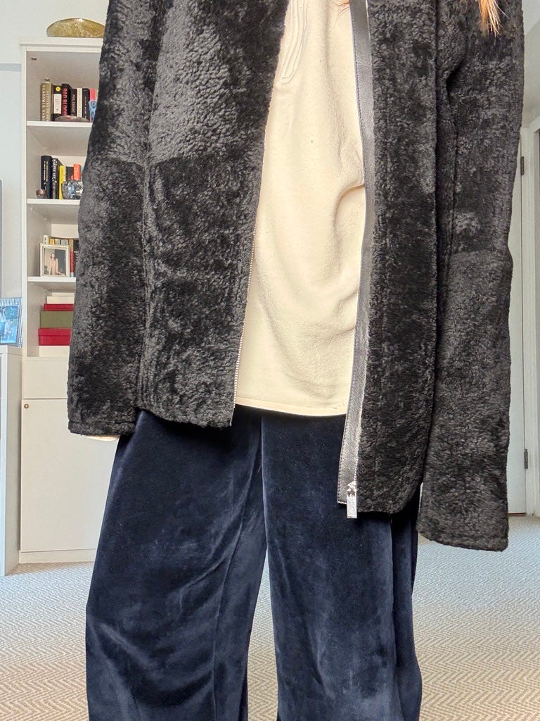 When sweats (even cute velvet ones!) might not be the look we are trying to project, I’ve been swapping them for my favorite cropped chinos. Any wider, cropped pant could make this silhouette work, though. Like what about this crisp blue jean, or this darker crop if slush splatter is a concern? TBH sometimes I wear white just to prove my weather reality doesn’t own me! 😈 Black wide and cropped “work” pants? Also a yes.