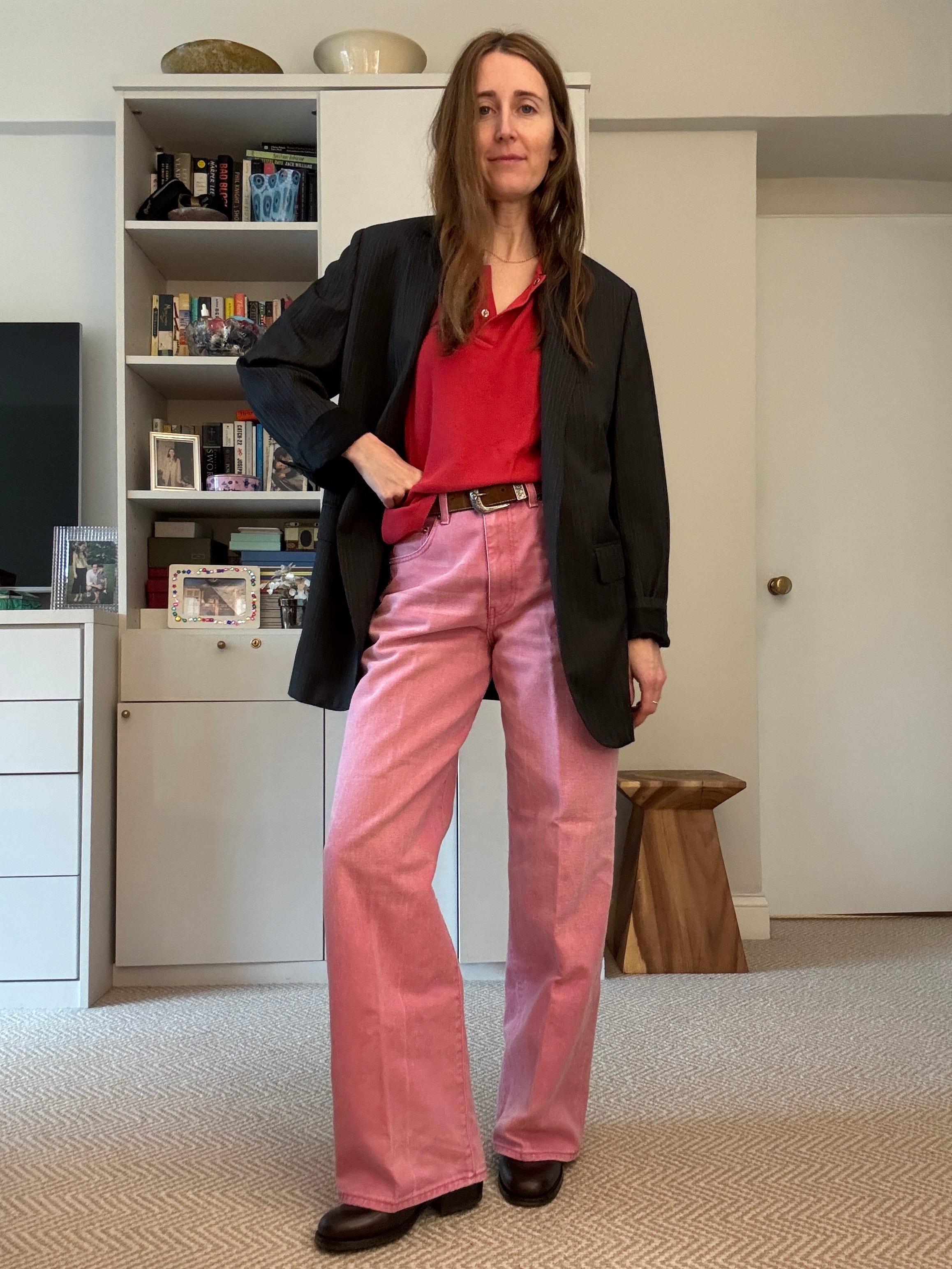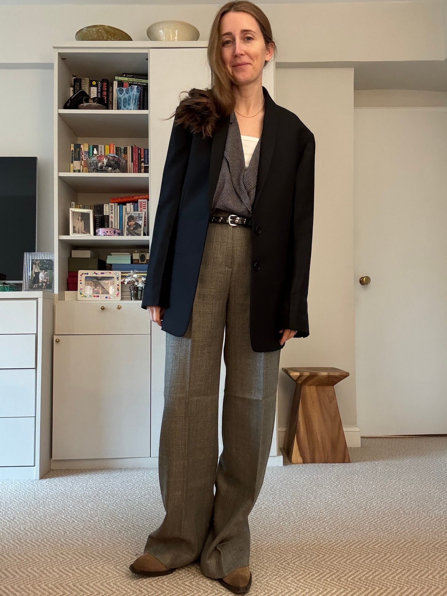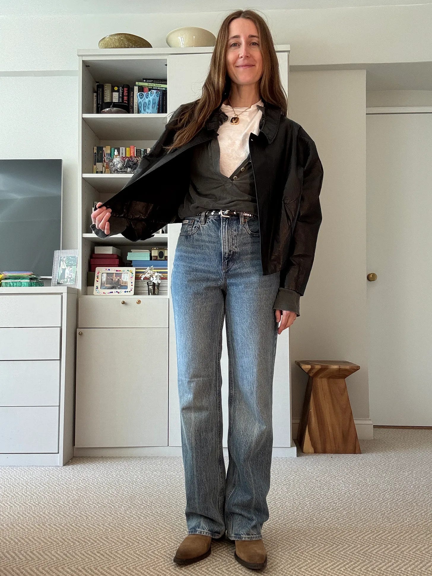 It’s a good middle layer for under a blazer or leather jacket without feeling too overstuffed. And still looks like a complete outfit when you remove said layer.