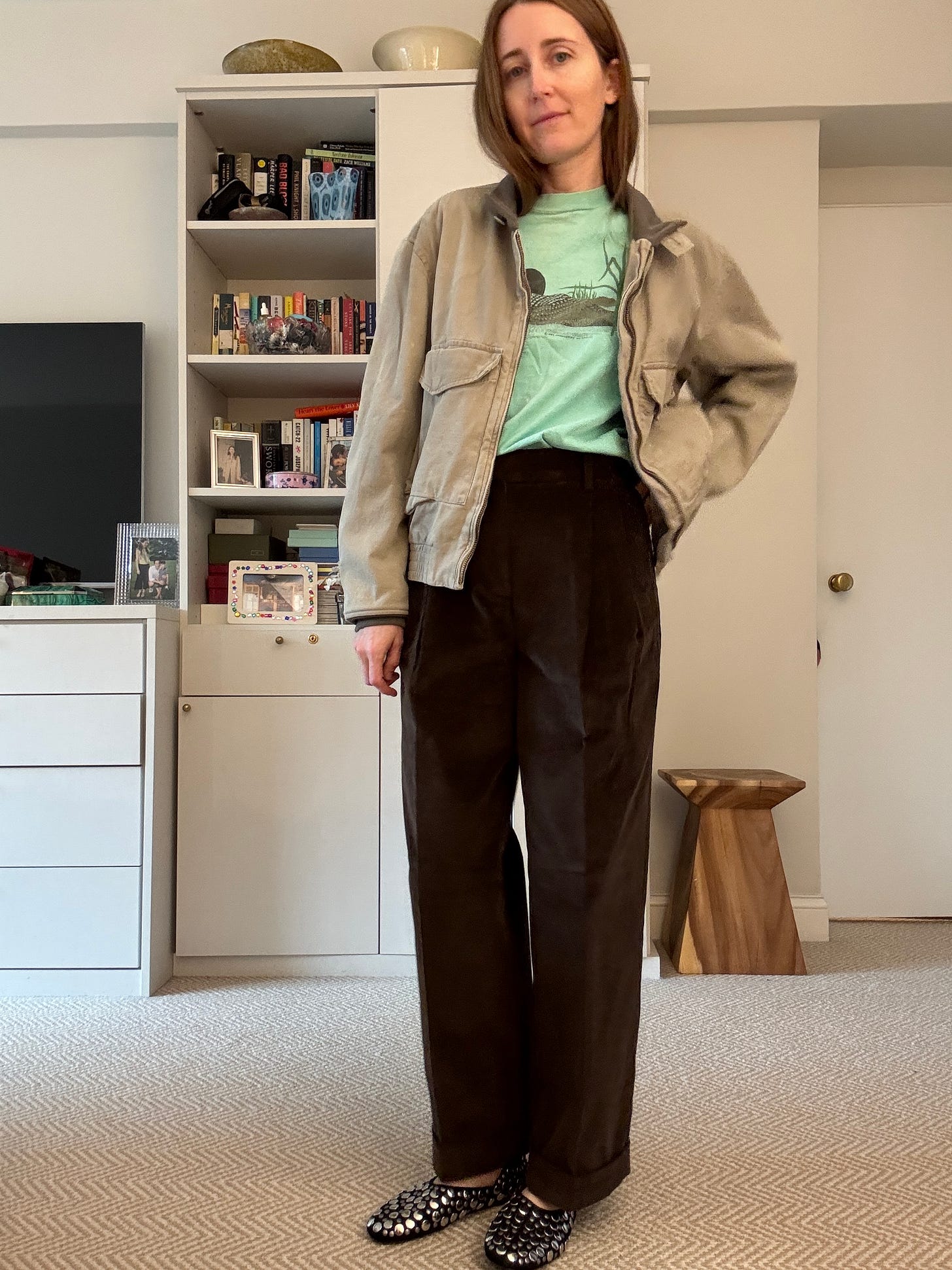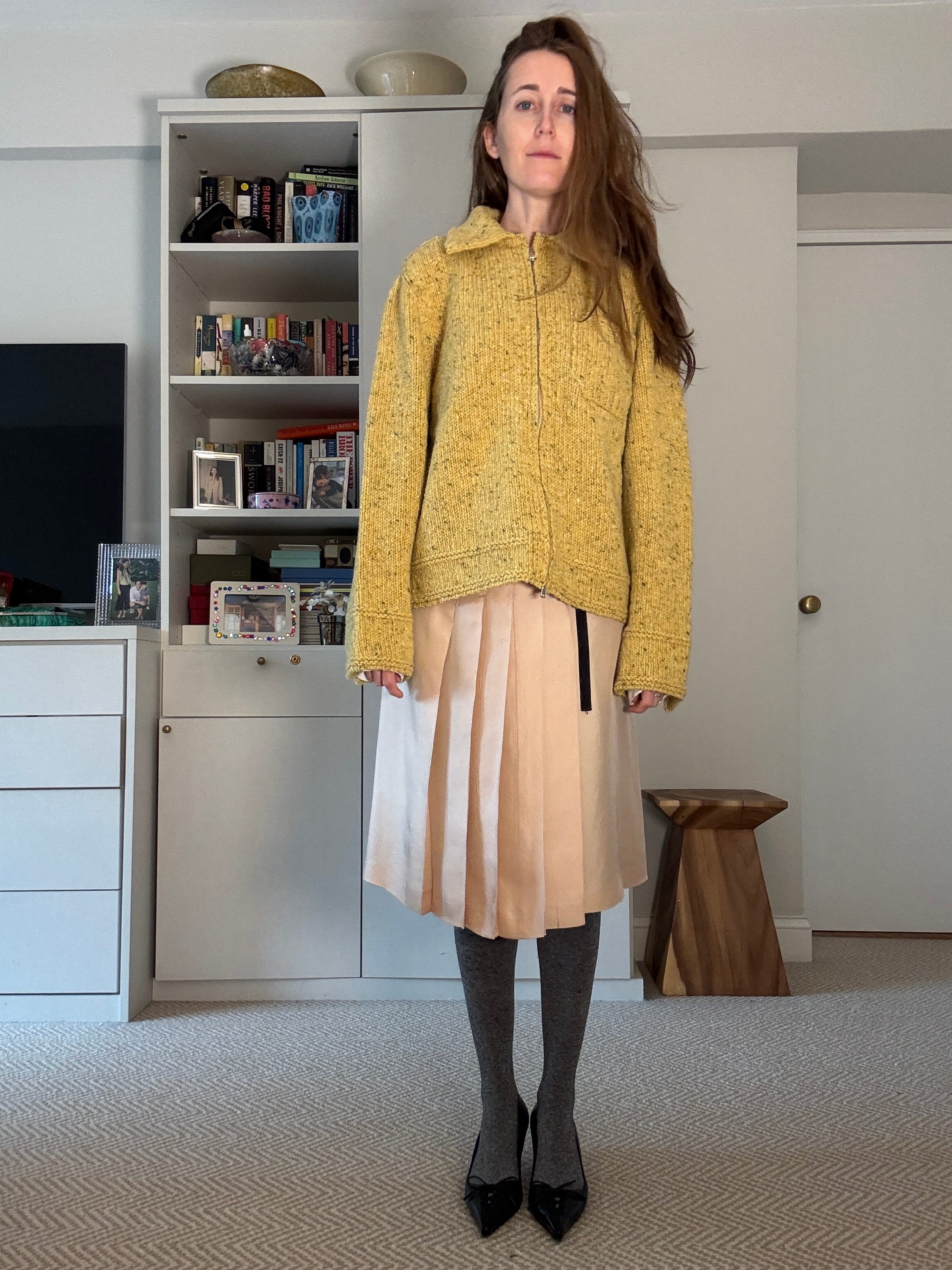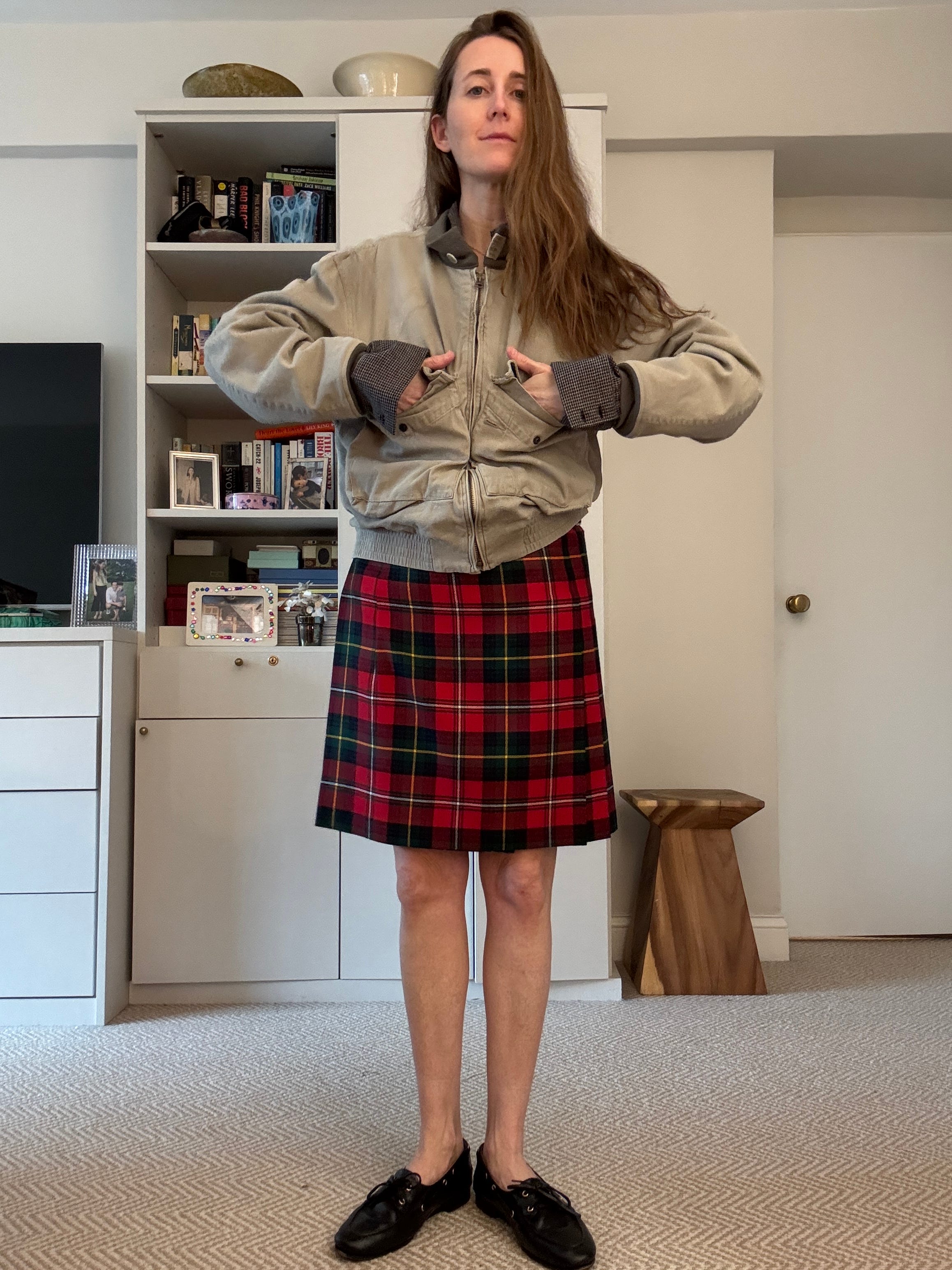 If I bring this whole rabbit hole — both the designers’ focus on craft and “aging” and my desire to soften around the edges — back to personal style, I end up in this: a well-loved (read: lean into stains!) jacket with a plaid kilt (my true spirit garment) and my most beloved shoes. In this outfit, I feel like everything is going to be OK. 💓