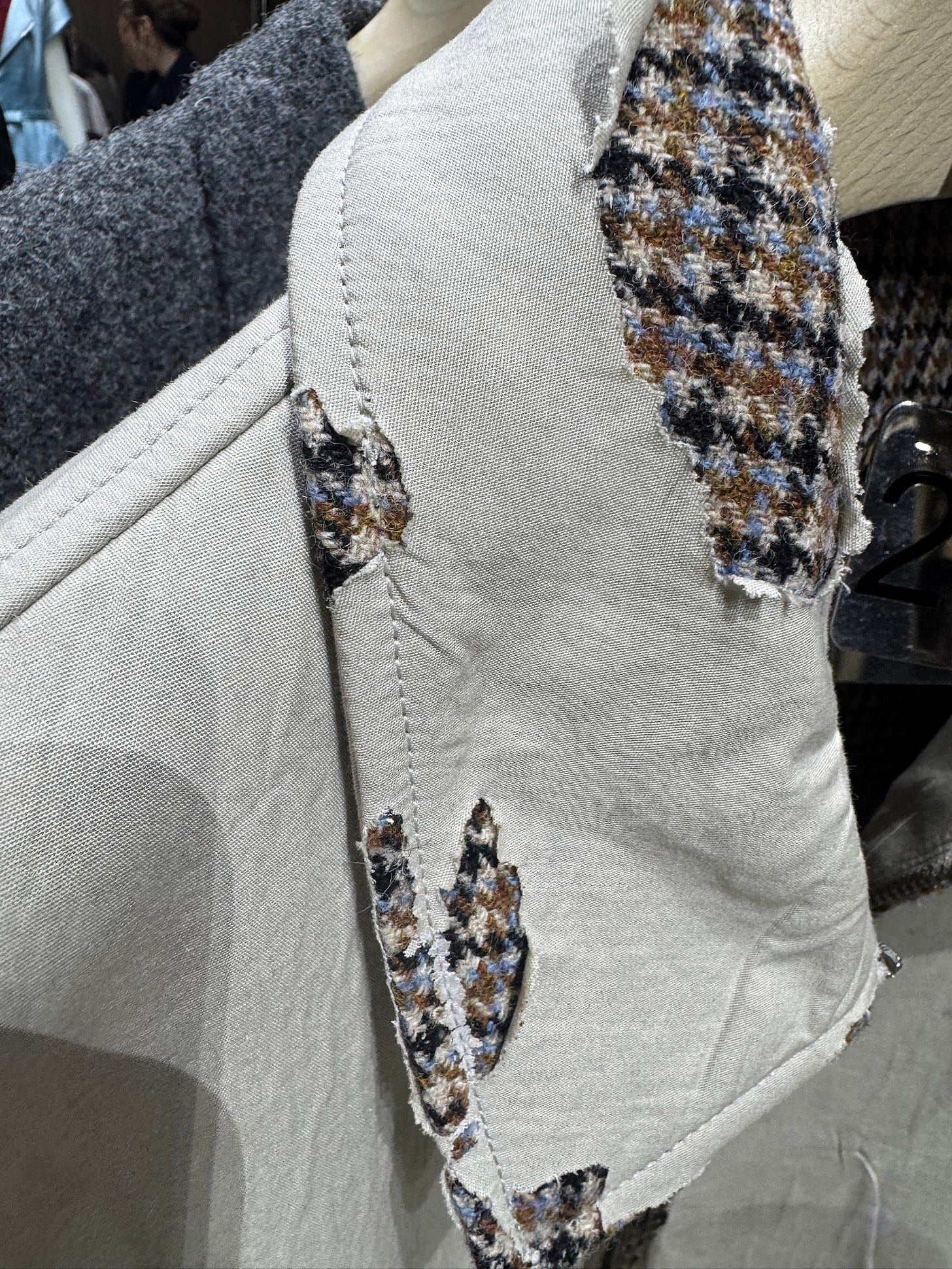 I could tell the designers at Milan Fashion week last week were grappling with the same questions. At Prada, coats and dresses appeared tattered: black cocktail dresses darned with floral brocades. Wool and canvas coats unevenly patched with herringbone. The big donegal-esque knits and scarves appearing (if not actually…but probably?) hand knitted.