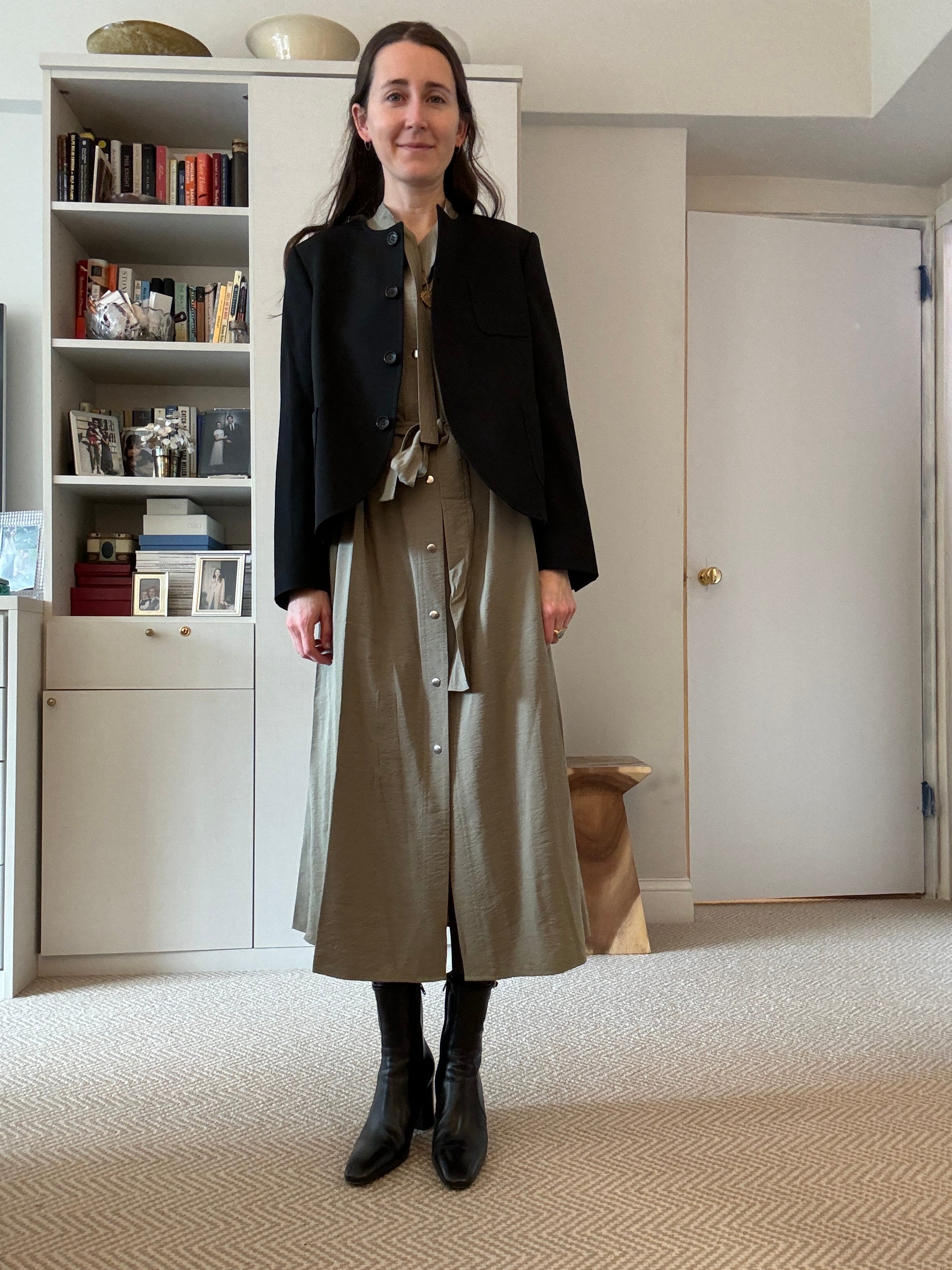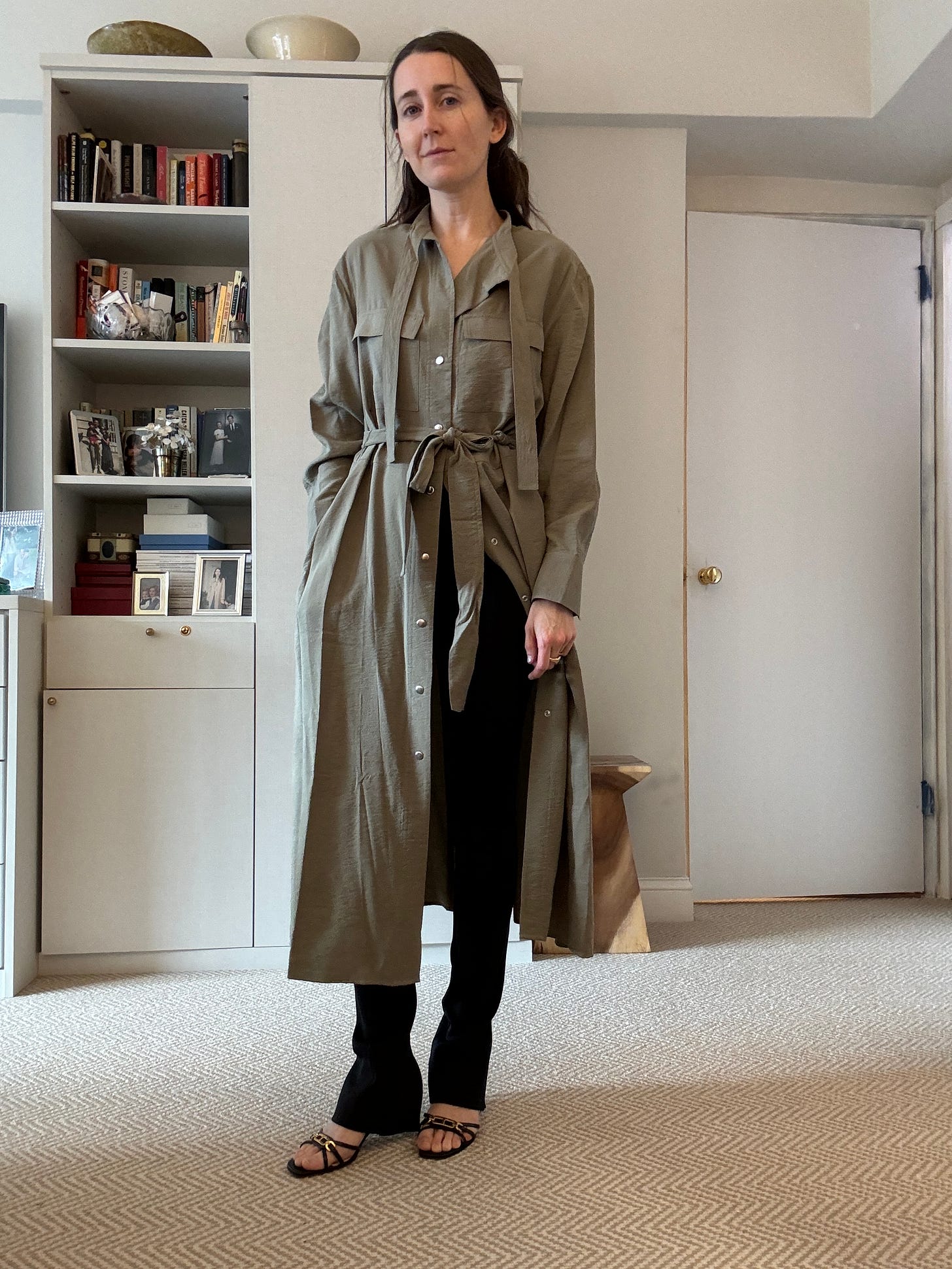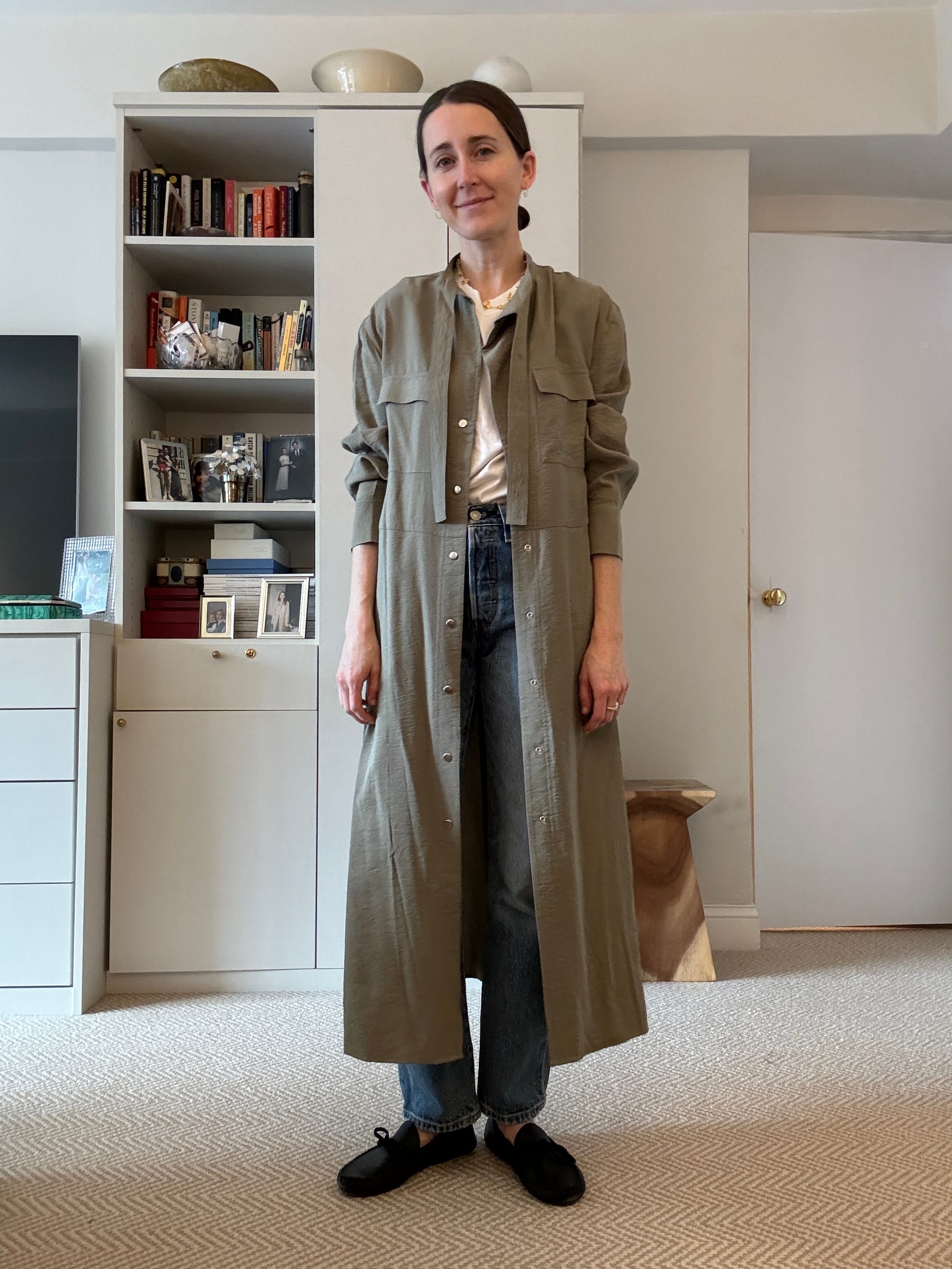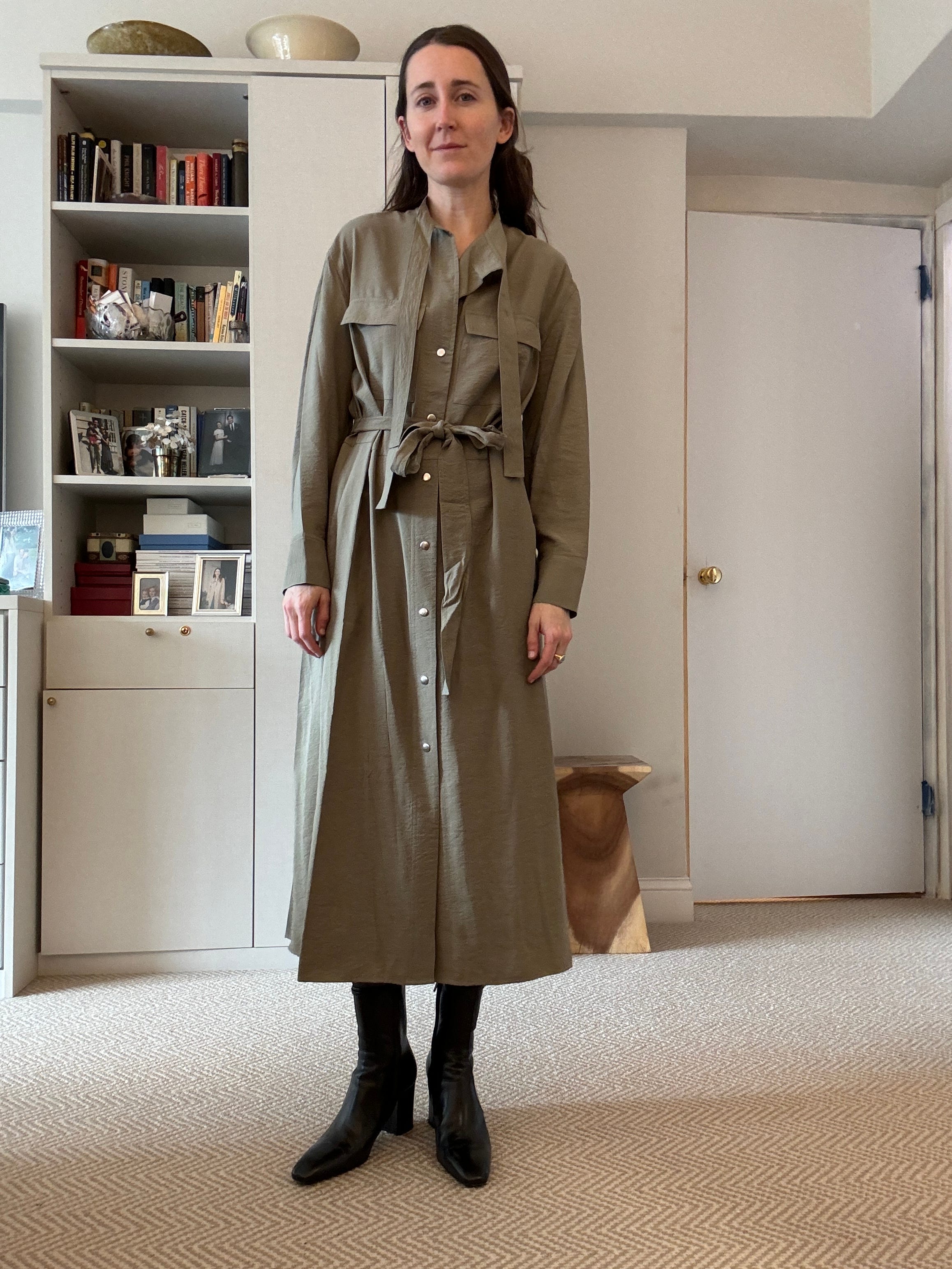 Dresses are hard for me (too few styling options!), but I know they are essential to a lot of you. And I think I found one that works for all of us. I love a long shirt dress. Short shirt dresses make us look like we forgot our pants. Yikes! Anyway, a long shirt dress is lovely, if you can find one in juuuuuust the right fabric. It can’t be too bulky, or stiff. Or too sheer, like most cotton varieties. This one hits all the notes. It’s made from a nylon-y material that feels perfect for the style. What I mean by this is that silk would be too flimsy, cotton too crunchy. It has a hint of techi-ness making it less “classic". The shape flows well when closed and buttoned all the way. And it opens up to layer as a top or a jacket. I even kept it creased as a nod to Mrs. Prada. :) I’m wearing a size XS.
