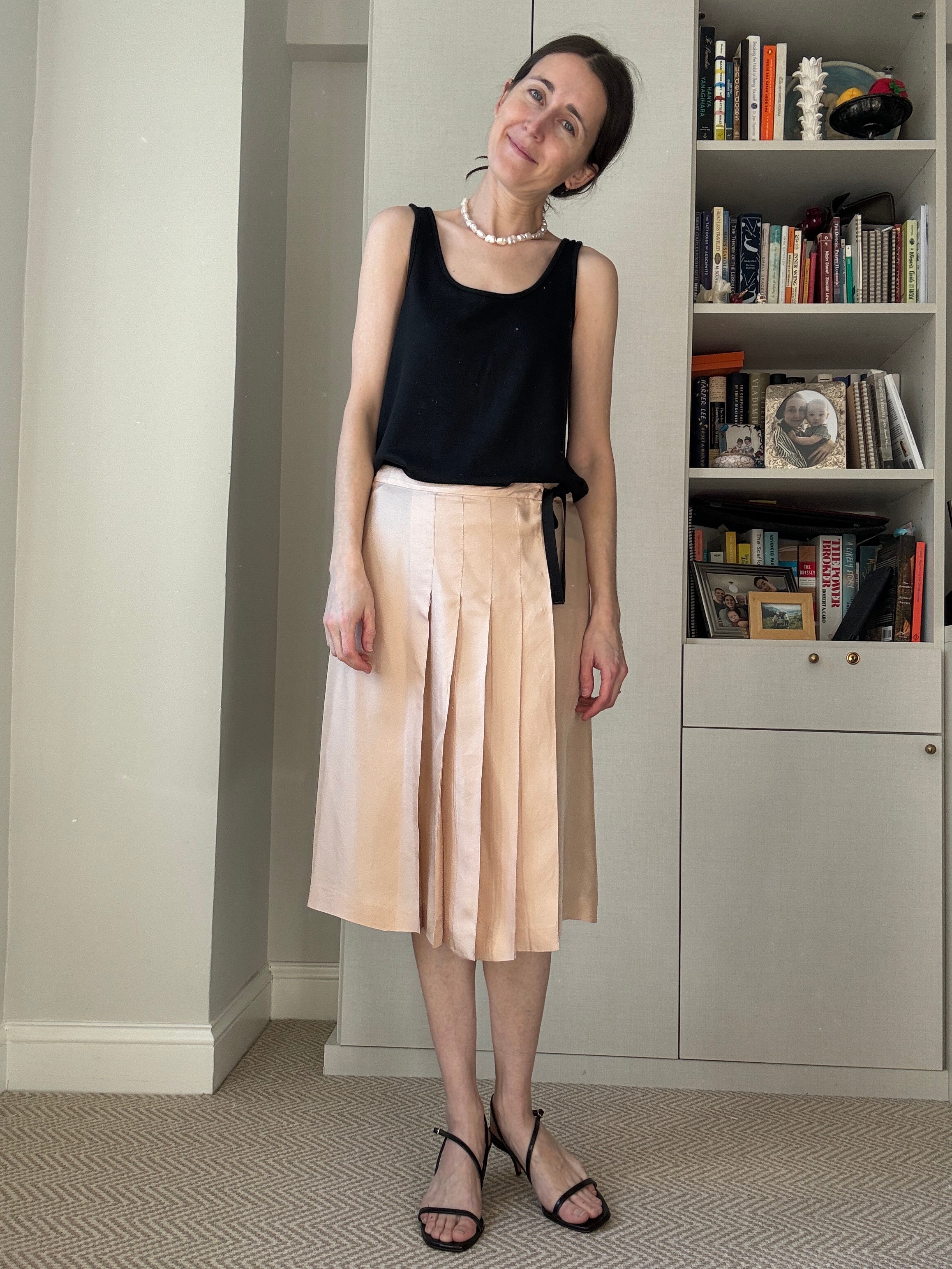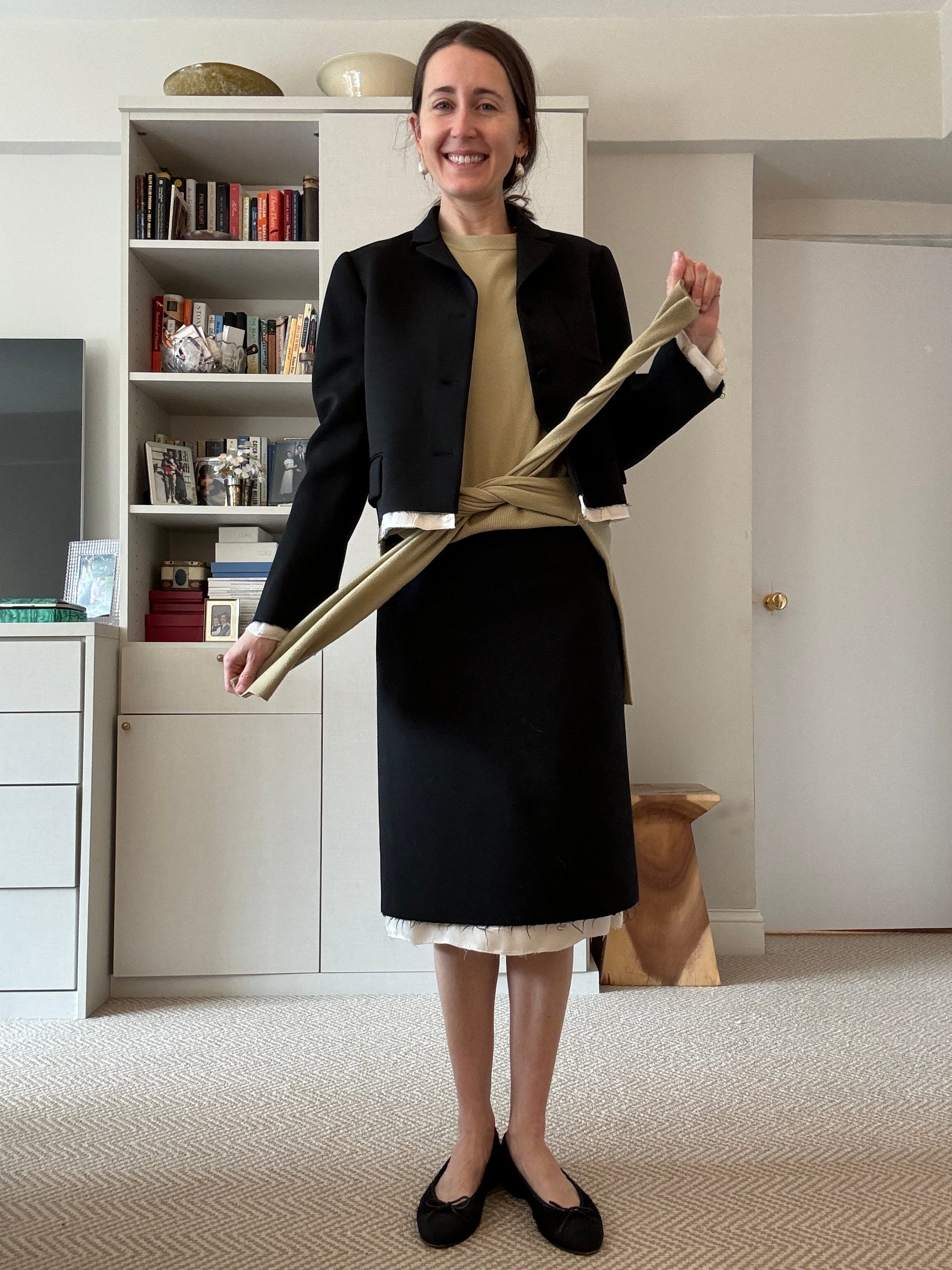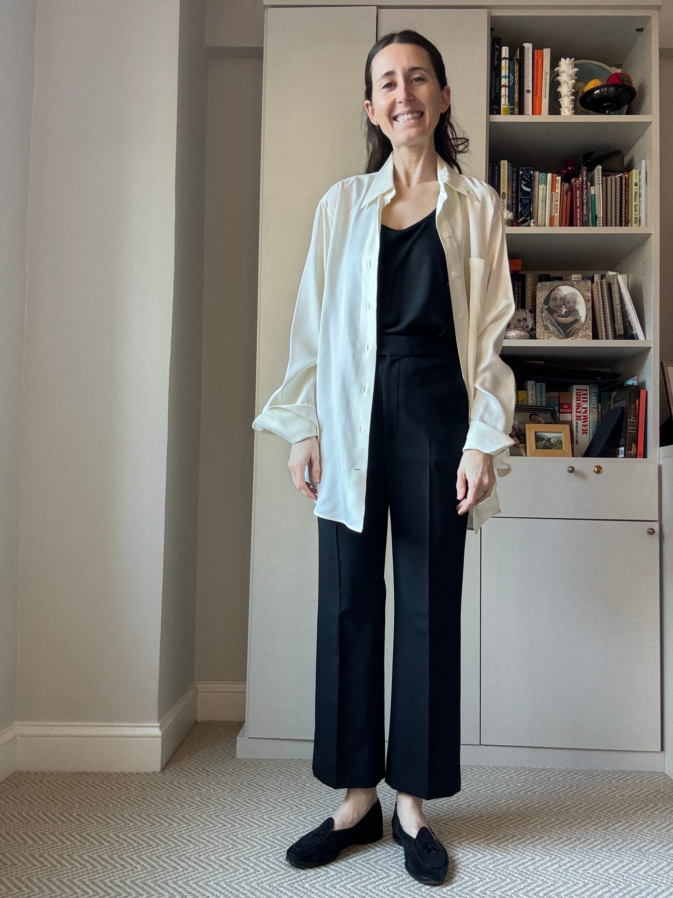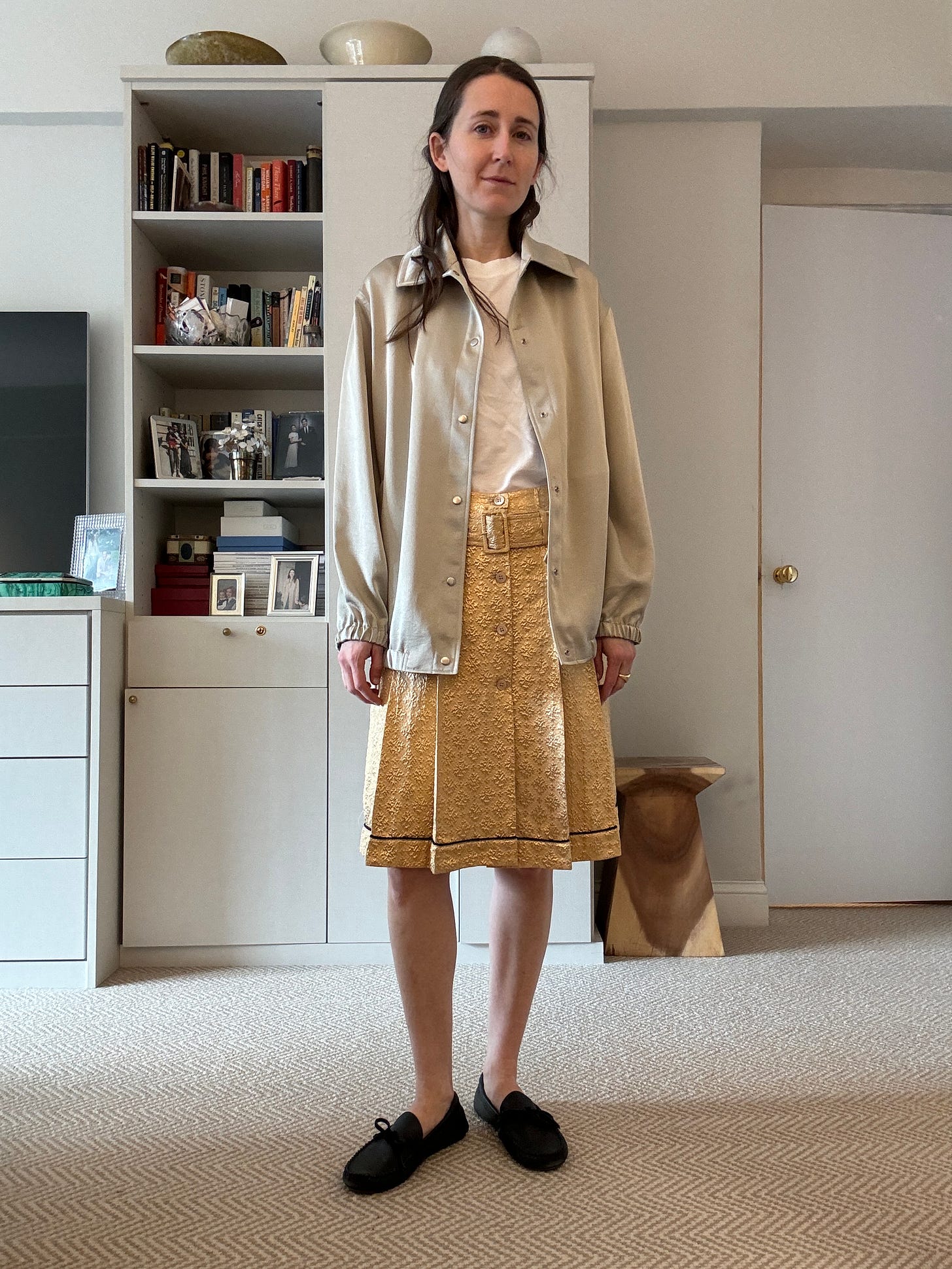 Dresses are hard for me (too few styling options!), but I know they are essential to a lot of you. And I think I found one that works for all of us. I love a long shirt dress. Short shirt dresses make us look like we forgot our pants. Yikes! Anyway, a long shirt dress is lovely, if you can find one in juuuuuust the right fabric. It can’t be too bulky, or stiff. Or too sheer, like most cotton varieties. This one hits all the notes. It’s made from a nylon-y material that feels perfect for the style. What I mean by this is that silk would be too flimsy, cotton too crunchy. It has a hint of techi-ness making it less “classic". The shape flows well when closed and buttoned all the way. And it opens up to layer as a top or a jacket. I even kept it creased as a nod to Mrs. Prada. :) I’m wearing a size XS.