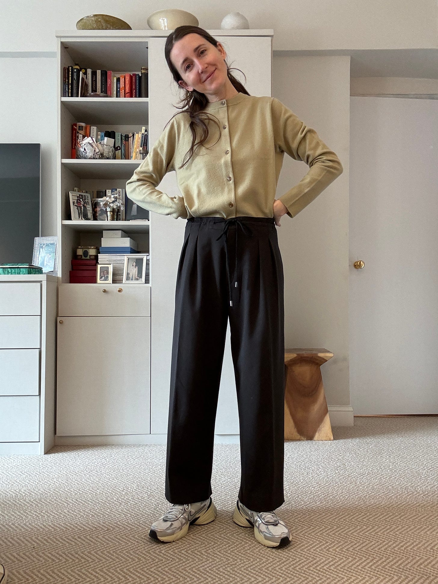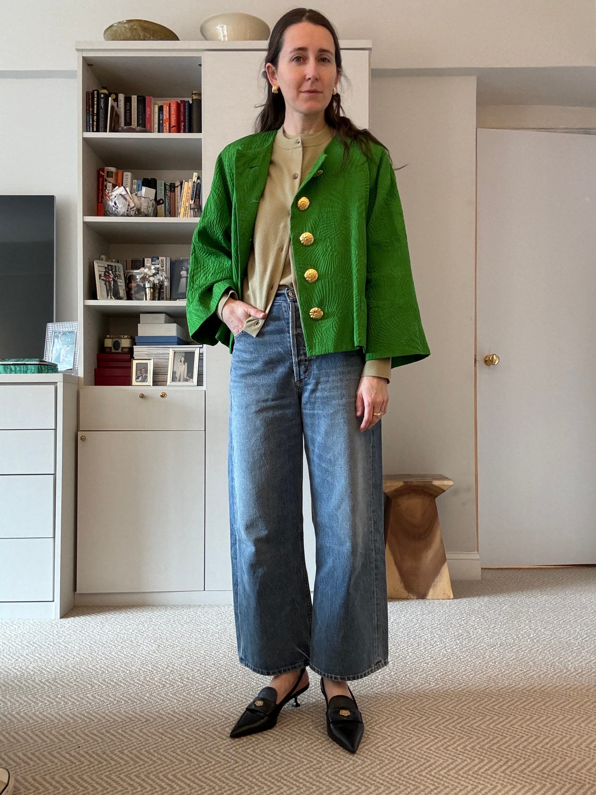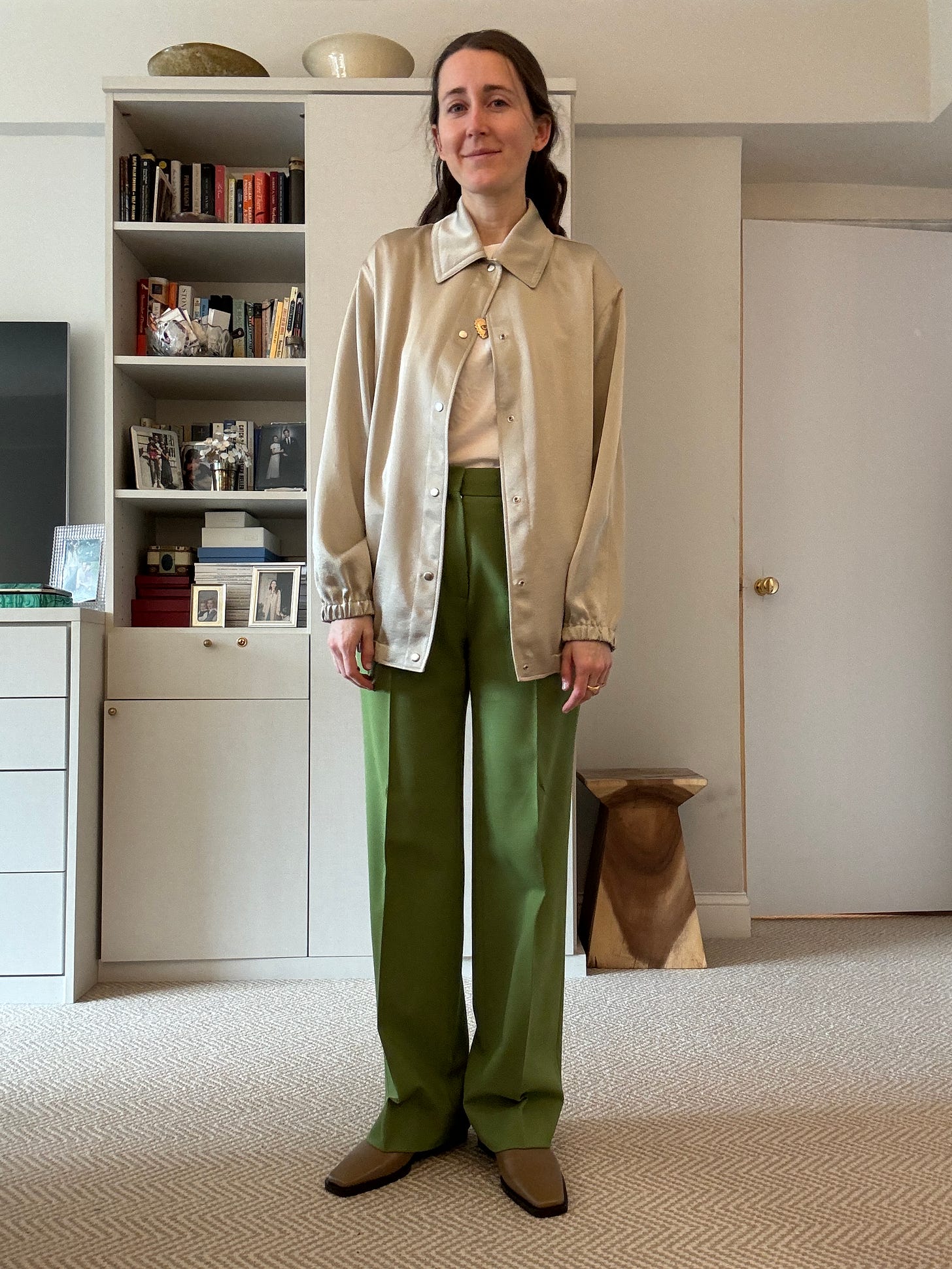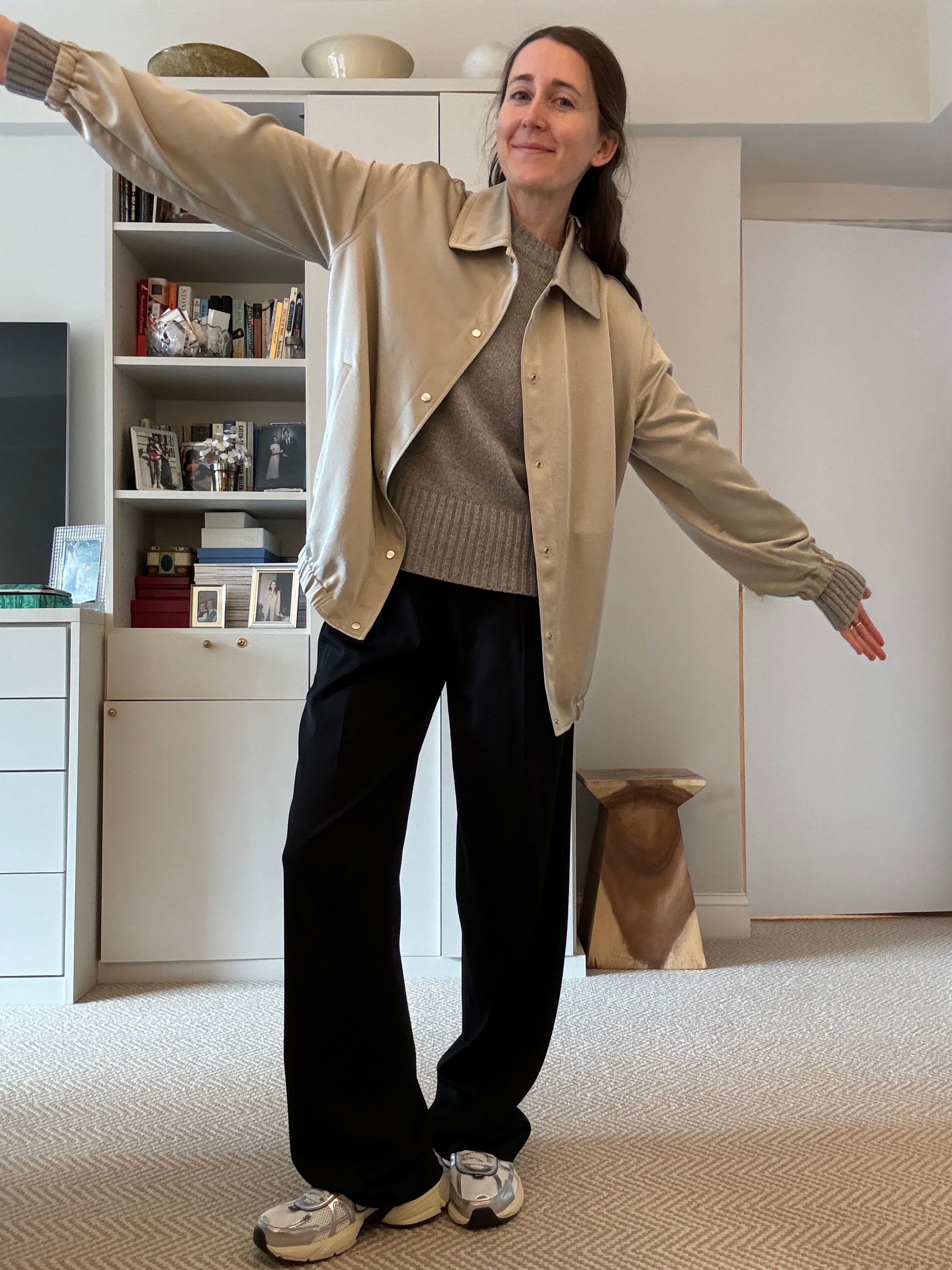 I have a weakness for khaki jackets. I have too many! And they’re all just a little different…so much for my great start to the year of closest editing. It’s a category I don’t dare edit in my closet. This newest one, a perfectly drapey, silky, cover-my-bum coaches jacket is totally IT! The layer that makes everything else luxe and cool and casual and dressed all at once. It’s a showstopper! Without screaming, naturally. Wear it instead of a blazer, or that sweater you’ve worn everyday for the past two months. Pair her with jeans. With your favorite vintage Prada. With the pants that have changed our lives! I’m wearing a size small.