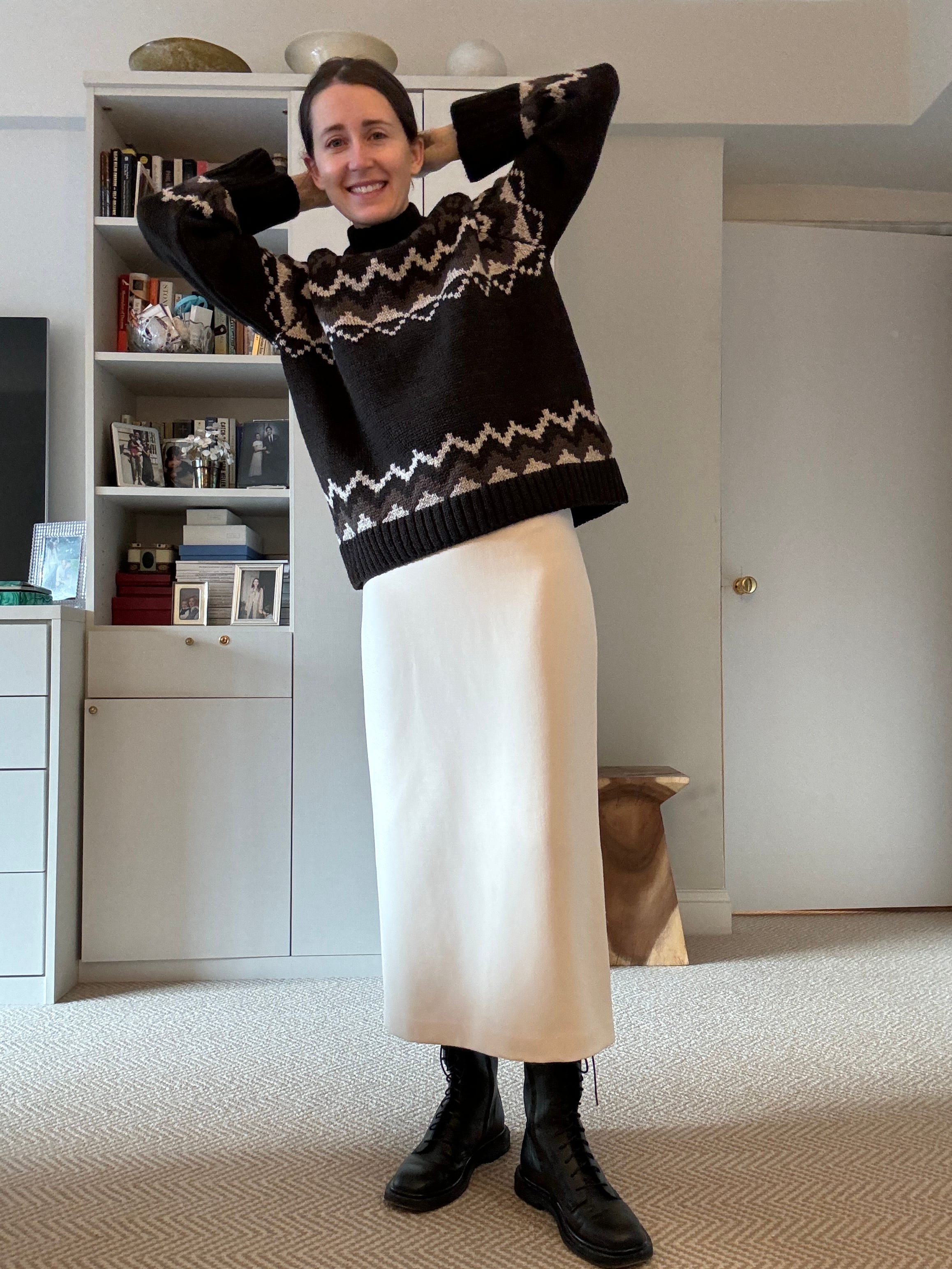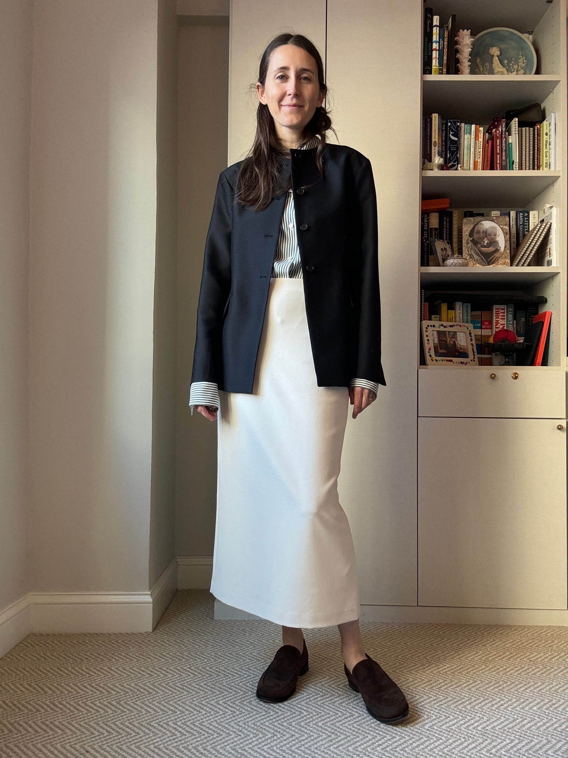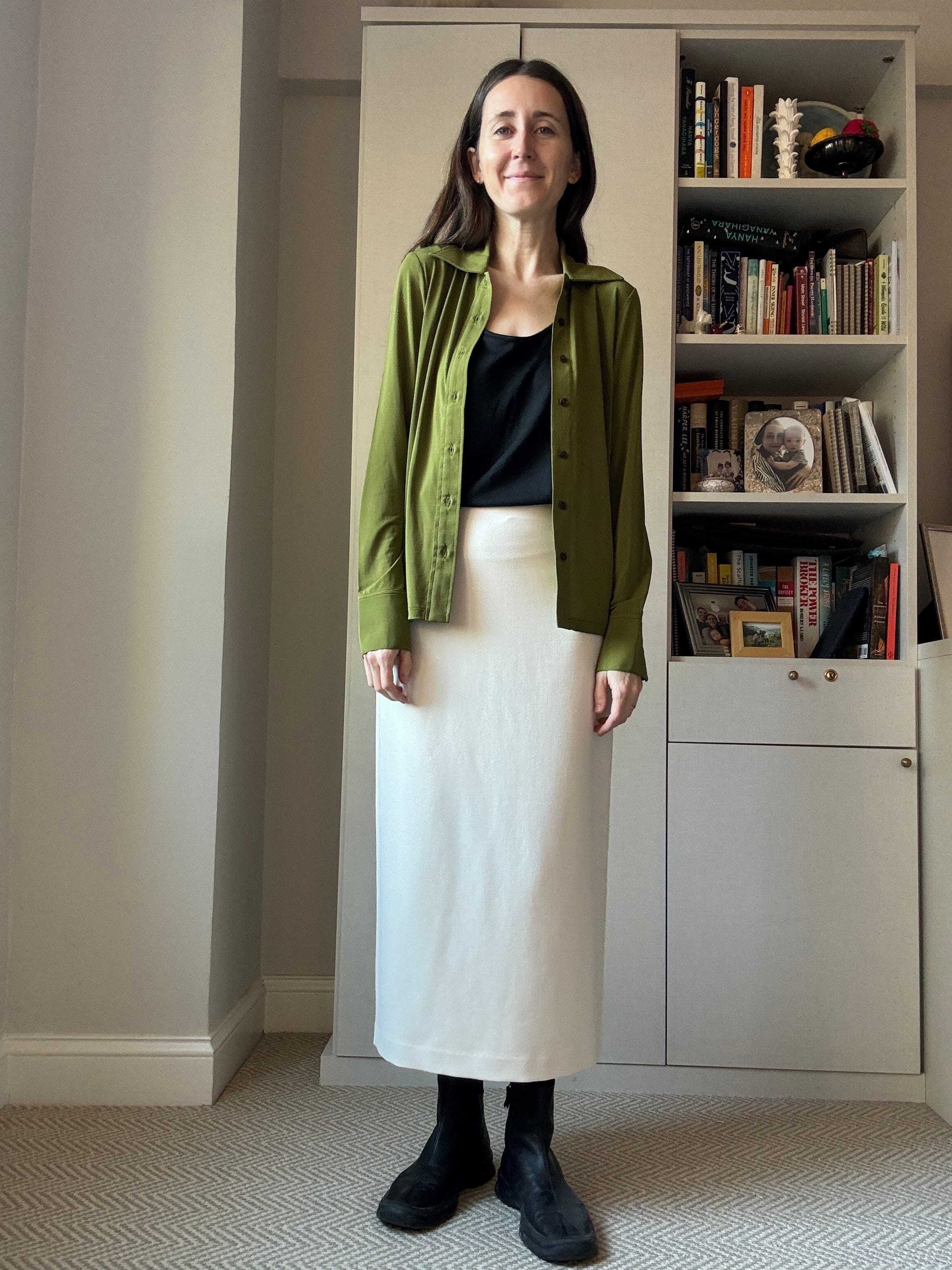 You got a sneak peek of this skirt two weeks ago in our Armani jacket letter. It’s been such a great piece to play with over the past few weeks when we had that tease of early Spring weather in NYC. The not quite white and the straight but not tight silhouette make this a joy to throw on. I don’t get as fearful with off white as I do with a stark white for some reason! And the loose but not bohemian shape works with boots and loafers and heels and Birkenstocks! She might not be for running out to the acupuncturist but she’s definitely an office and weekend-plans-where-you-actually-have-to-ditch-your-sweats hero. I’m wearing a size 2, for reference.