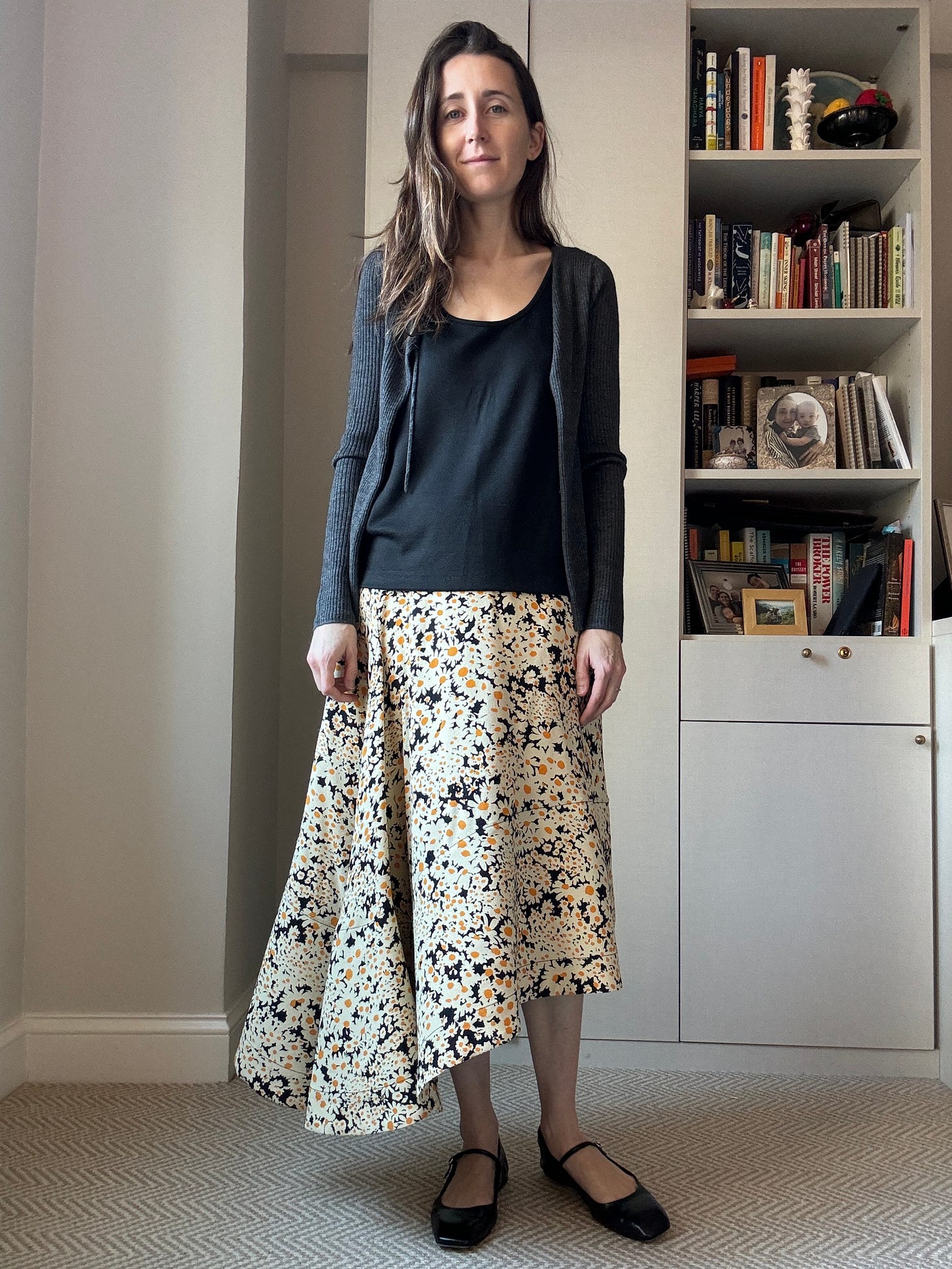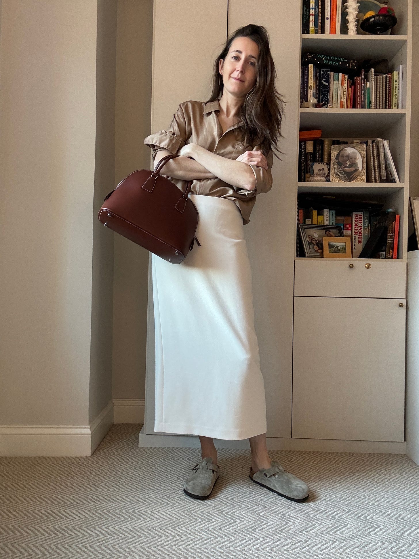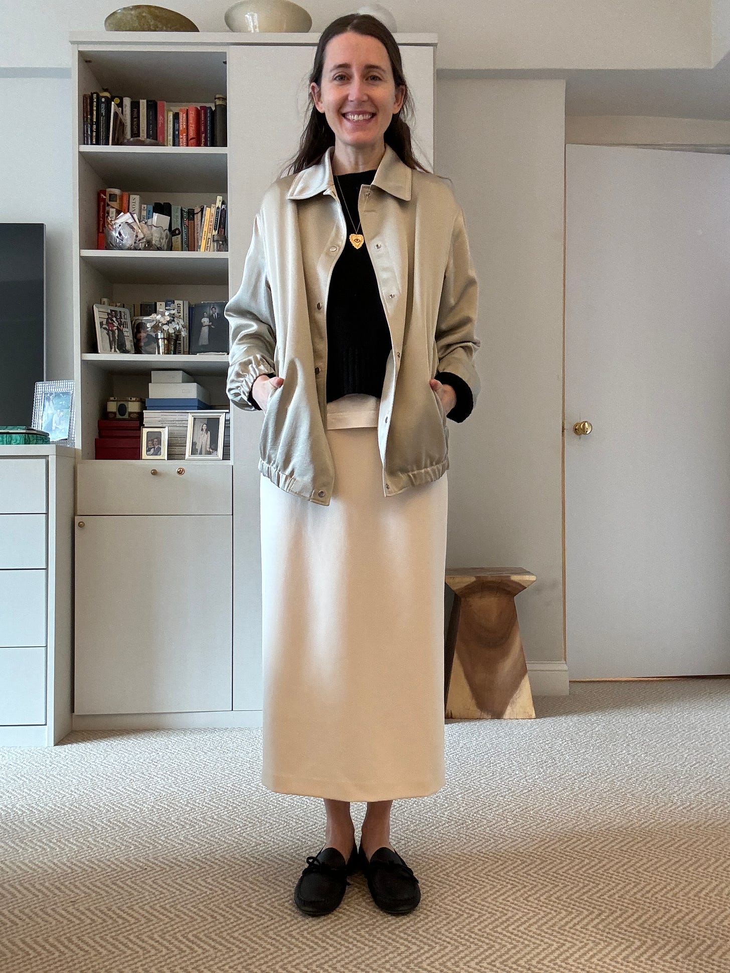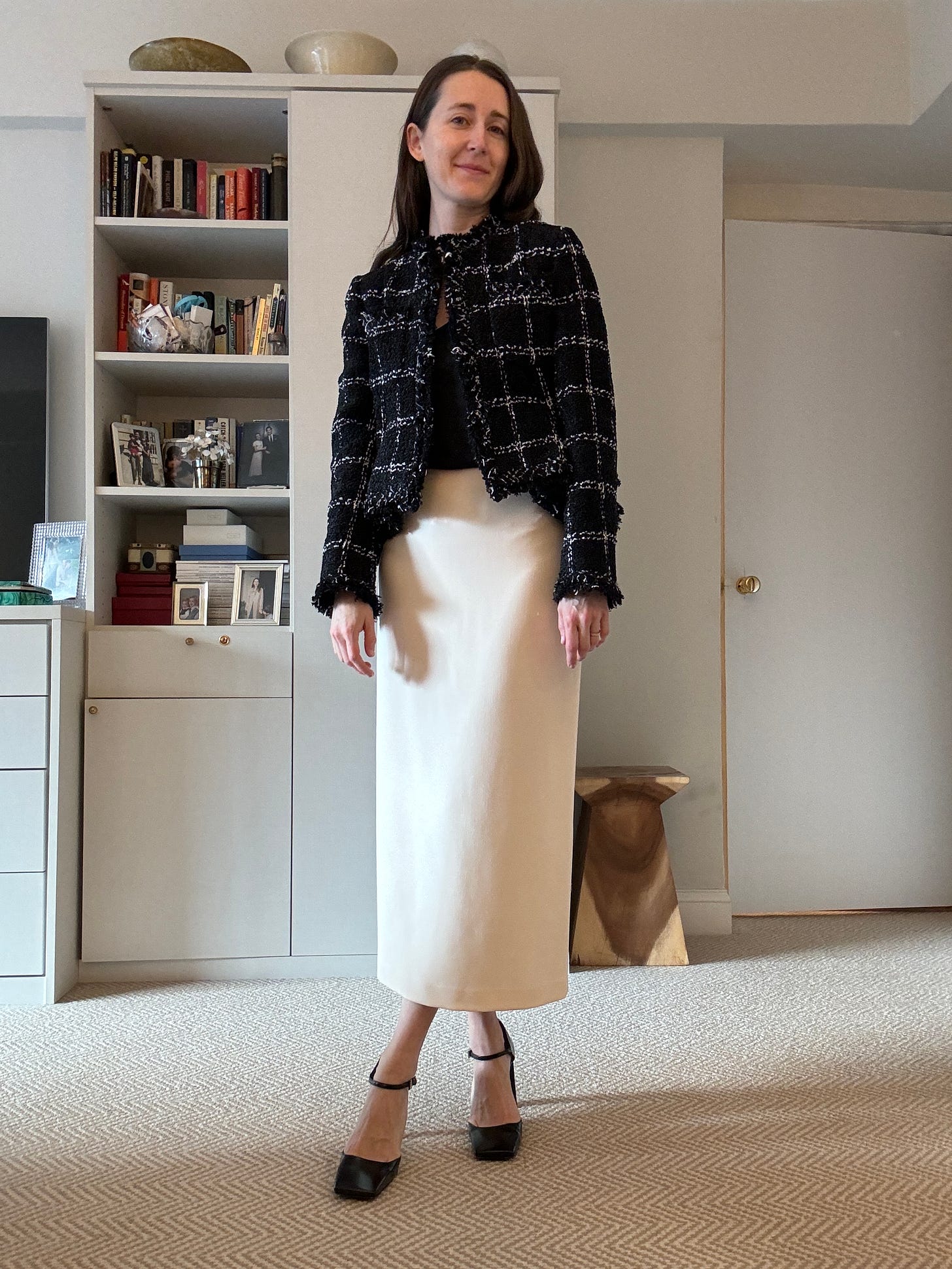 You got a sneak peek of this skirt two weeks ago in our Armani jacket letter. It’s been such a great piece to play with over the past few weeks when we had that tease of early Spring weather in NYC. The not quite white and the straight but not tight silhouette make this a joy to throw on. I don’t get as fearful with off white as I do with a stark white for some reason! And the loose but not bohemian shape works with boots and loafers and heels and Birkenstocks! She might not be for running out to the acupuncturist but she’s definitely an office and weekend-plans-where-you-actually-have-to-ditch-your-sweats hero. I’m wearing a size 2, for reference.
