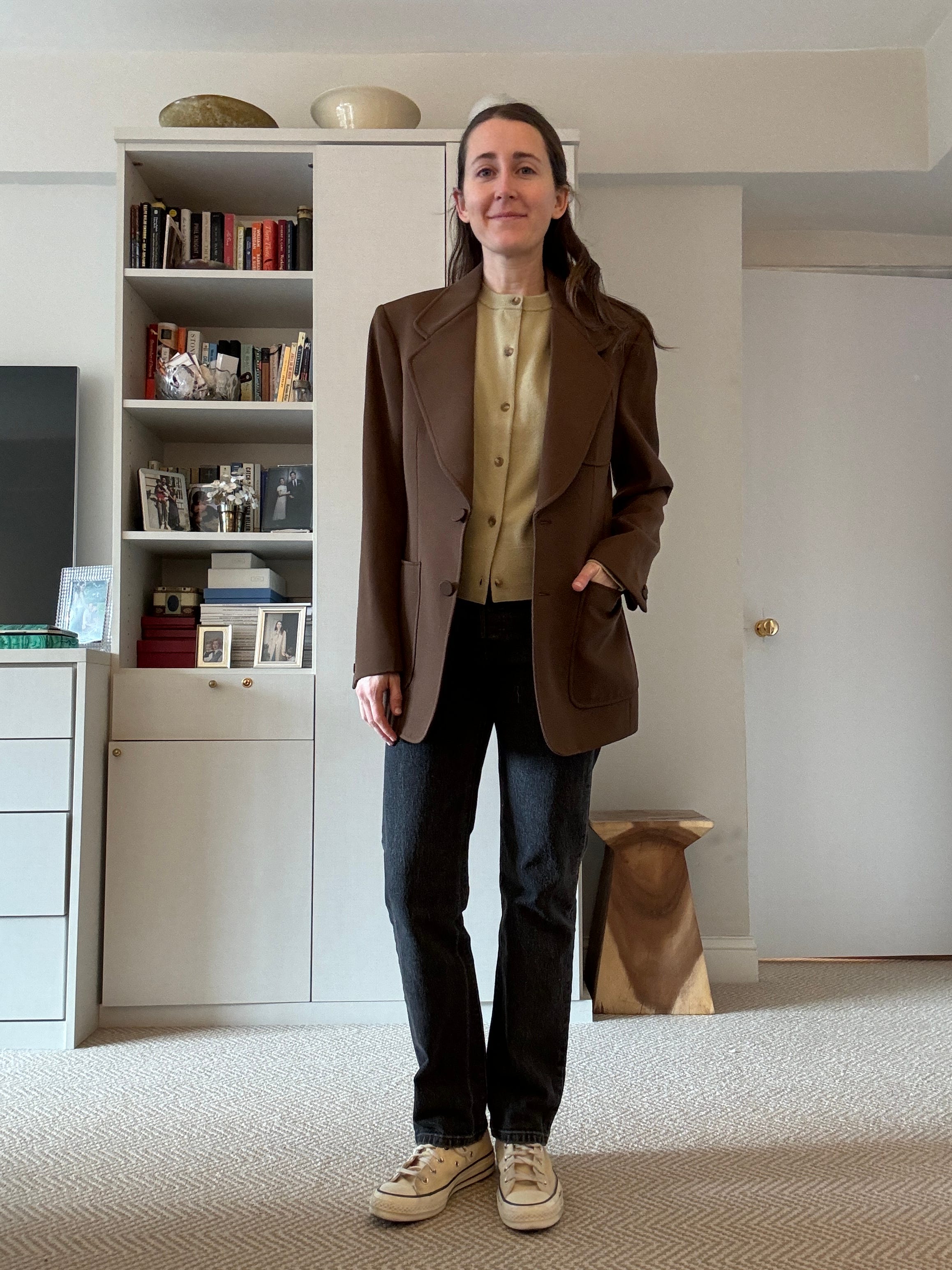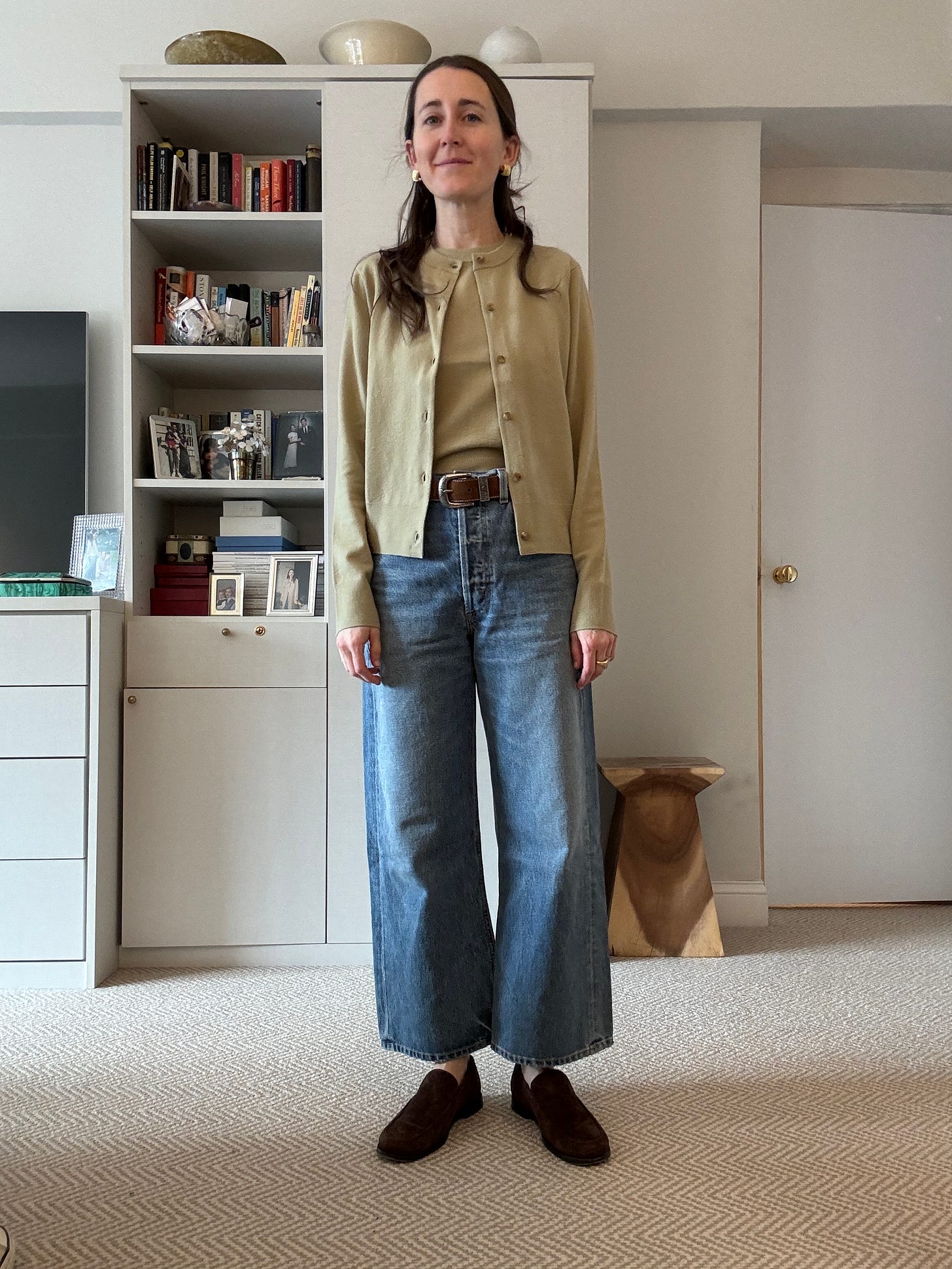 Swan fever!!!!!! Give me skirt suits. Twin sets. Button earrings! This little duo (really two things) has blessed us in an incredible shade of khaki with a hint of green…in a Benjamin Moore way that only makes sense if you’ve been staring way too long. Something about the prim-ness in this sort of new age color palette feels rebellious. It adds a point of interest in a way that a simple crewneck does not, without screaming “look I know styling tricks!” It can be a scarf or a belt. It can be worn as a top, buttoned all the way up and tucked in. Or it can give a little texture to your standard jeans and blazer uniform. What can’t she do!? I’m wearing a size Small in both.
